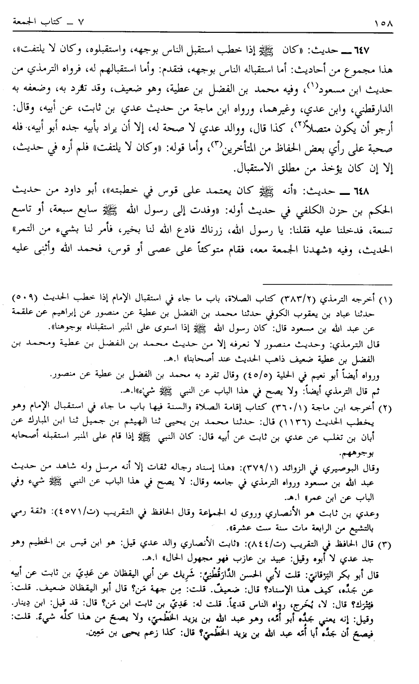 647 - حَدِيثُ كَانَ صَلَّى اللَّهُ عَلَيْهِ وَسَلَّمَ إذَا خَطَبَ اسْتَقْبَلَ النَّاسَ بِوَجْهِهِ وَاسْتَقْبَلُوهُ وَكَانَ لَا يَلْتَفِتُ هَذَا مَجْمُوعٌ مِنْ أَحَادِيثَ أَمَّا اسْتِقْبَالُهُ النَّاسَ بِوَجْهِهِ فَتَقَدَّمَ وَأَمَّا اسْتِقْبَالُهُمْ لَهُ فَرَوَاهُ التِّرْمِذِيُّ مِنْ حَدِيثِ ابْنِ مَسْعُودٍ1 وَفِيهِ مُحَمَّدُ بْنُ الْفَضْلِ بْنُ عَطِيَّةَ وَهُوَ ضَعِيفٌ وَقَدْ تَفَرَّدَ بِهِ وَضَعَّفَهُ بِهِ الدَّارَقُطْنِيُّ وَابْنُ عَدِيٍّ وَغَيْرُهُمَا وَرَوَاهُ ابْنُ مَاجَهْ مِنْ حَدِيثِ عَدِيِّ بْنِ ثَابِتٍ عَنْ أَبِيهِ وَقَالَ أَرْجُو أَنْ يَكُونَ مُتَّصِلًا2 كَذَا قَالَ وَوَالِدُ عَدِيٍّ لَا صُحْبَةَ لَهُ إلَّا أَنْ يُرَادَ بِأَبِيهِ جَدُّهُ أَبُو أَبِيهِ فَلَهُ صُحْبَةٌ عَلَى رَأْيِ بَعْضِ الْحُفَّاظِ مِنْ الْمُتَأَخِّرِينَ3 وَأَمَّا قَوْلُهُ وَكَانَ لَا يَلْتَفِتُ فَلَمْ أَرَهُ فِي حَدِيثٍ إلَّا إنْ كَانَ يُؤْخَذُ مِنْ مُطْلَقِ الِاسْتِقْبَالِ.