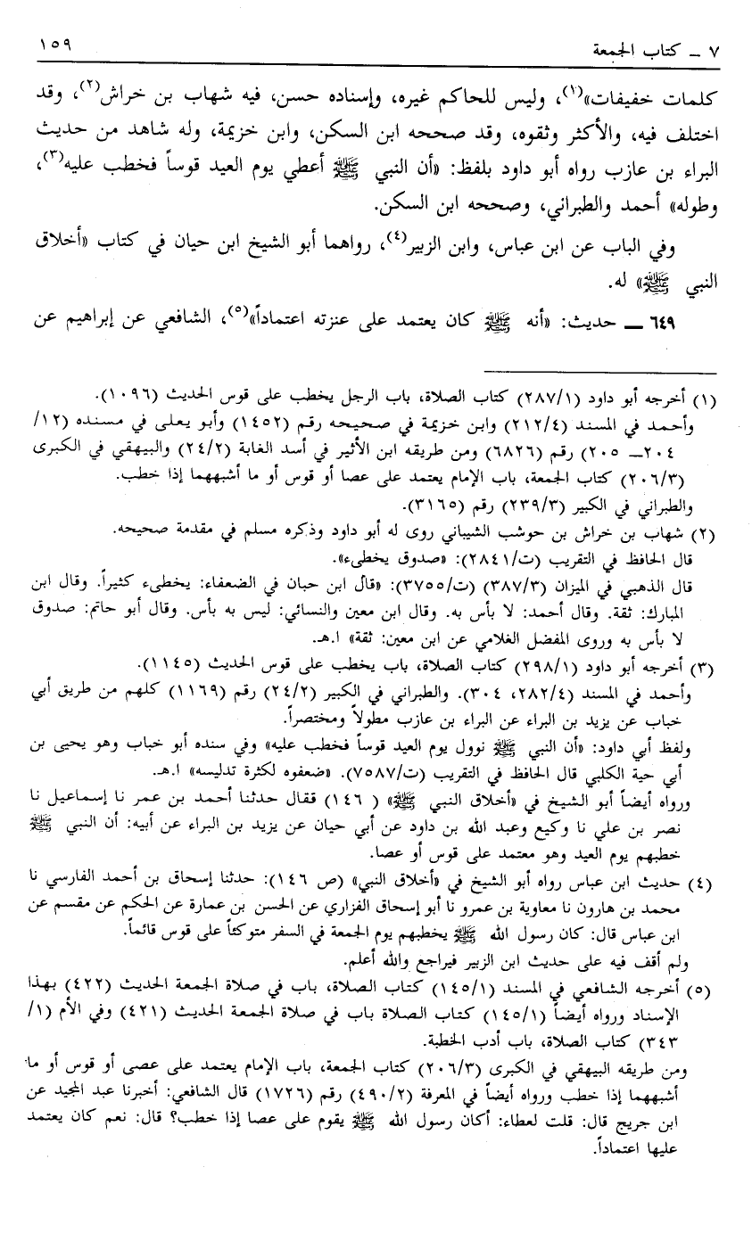 كَلِمَاتٍ خَفِيفَاتٍ1 وَلَيْسَ لِلْحَاكِمِ غَيْرُهُ وَإِسْنَادُهُ حَسَنٌ فِيهِ شِهَابُ بْنُ خراش2 وقد اختلف فهي وَالْأَكْثَرُ وَثَّقُوهُ وَقَدْ صَحَّحَهُ ابْنُ السَّكَنِ وَابْنُ خُزَيْمَةَ وَلَهُ شَاهِدٌ مِنْ حَدِيثِ الْبَرَاءِ بْنِ عَازِبٍ رَوَاهُ أَبُو دَاوُد بِلَفْظِ أَنَّ النَّبِيَّ صَلَّى اللَّهُ عَلَيْهِ وَسَلَّمَ أُعْطِيَ يَوْمَ الْعِيدِ قَوْسًا فَخَطَبَ عَلَيْهِ3 وَطَوَّلَهُ أَحْمَدُ وَالطَّبَرَانِيُّ وَصَحَّحَهُ ابْنُ السَّكَنِ وَفِي الْبَابِ عَنْ ابْنِ عَبَّاسٍ وَابْنِ الزُّبَيْرِ4 رَوَاهُمَا أَبُو الشَّيْخِ ابْنُ حَيَّانَ فِي كِتَابِ أَخْلَاقِ النَّبِيِّ صَلَّى اللَّهُ عَلَيْهِ وَسَلَّمَ لَهُ.