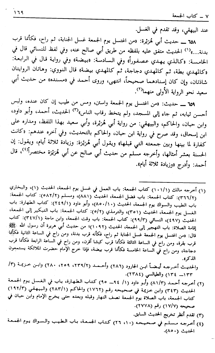 658 - حَدِيثُ أَبِي هُرَيْرَةَ "مَنْ اغْتَسَلَ يَوْمَ الْجُمُعَةِ غُسْلَ الْجَنَابَةِ ثُمَّ رَاحَ فَكَأَنَّمَا قَرَّبَ بَدَنَةً" 1 الحديث متفق عليه بلفظه مِنْ طَرِيقِ أَبِي صَالِحٍ عَنْهُ وَفِي لَفْظٍ لِلنَّسَائِيِّ قَالَ فِي الْخَامِسَةِ "كَاَلَّذِي يُهْدِي عُصْفُورًا" وَفِي السَّادِسَةِ بيضة وَفِي رِوَايَةٍ قَالَ فِي الرَّابِعَةِ كَالْمُهْدِي بَطَّةً ثُمَّ كَالْمُهْدِي دَجَاجَةٍ ثُمَّ كَالْمُهْدِي بَيْضَةٍ قَالَ النَّوَوِيُّ وَهَاتَانِ الرِّوَايَتَانِ شَاذَّتَانِ وَإِنْ كَانَ إسْنَادُهُمَا صَحِيحًا انْتَهَى وَرَوَى أَحْمَدُ فِي مُسْنَدِهِ مِنْ حَدِيثِ أَبِي سَعِيدٍ نَحْوَ الرِّوَايَةِ الْأُولَى مِنْهُمَا2.
