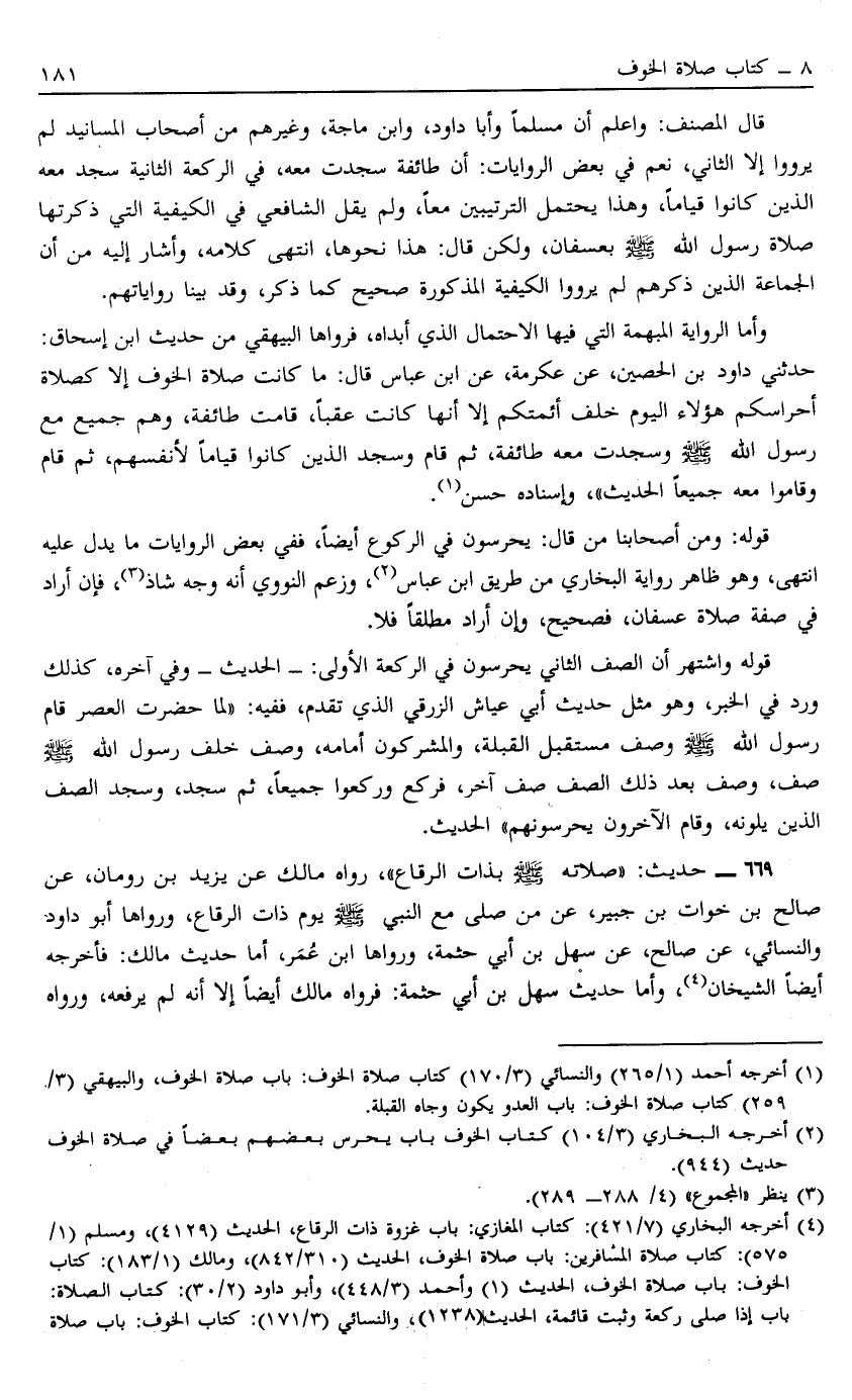 669 - حَدِيثٌ صَلَاتُهُ صَلَّى اللَّهُ عَلَيْهِ وَسَلَّمَ بِذَاتِ الرِّقَاعِ رَوَاهُ مَالِكٌ عَنْ يَزِيدَ بْنِ رُومَانَ عَنْ صَالِحِ بْن خَوَّاتِ بْنِ جُبَيْرٍ عَنْ مَنْ صَلَّى مَعَ النَّبِيِّ صَلَّى اللَّهُ عَلَيْهِ وَسَلَّمَ يَوْمَ ذَاتِ الرِّقَاعِ وَرَوَاهَا أَبُو دَاوُد وَالنَّسَائِيُّ عَنْ صَالِحٍ عَنْ سَهْلِ بْنِ أَبِي حَثْمَةَ وَرَوَاهَا ابْنُ عُمَرَ أَمَّا حَدِيثُ مَالِكٍ فَأَخْرَجَهُ أَيْضًا الشَّيْخَانِ4 وَأَمَّا حَدِيثُ سَهْلِ بْنِ أَبِي حَثْمَةَ فَرَوَاهُ مَالِكٌ أَيْضًا إلَّا أَنَّهُ لَمْ يَرْفَعْهُ وَرَوَاهُ