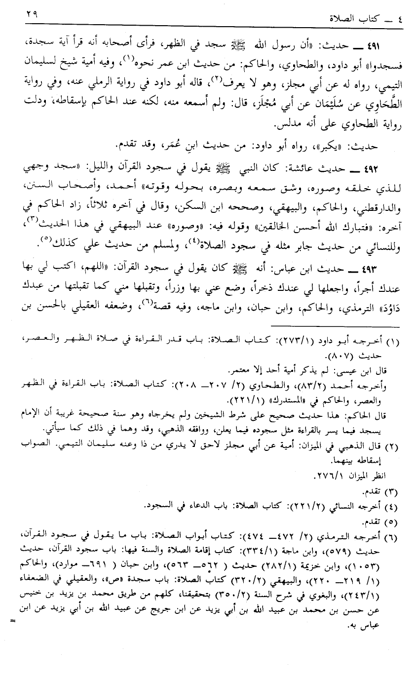 492 - حَدِيثُ عَائِشَةَ كَانَ النَّبِيُّ صَلَّى اللَّهُ عَلَيْهِ وَسَلَّمَ يَقُولُ فِي سُجُودِ الْقُرْآنِ بِاللَّيْلِ "سَجَدَ وجهي اللذي خَلَقَهُ وَصَوَّرَهُ وَشَقَّ سَمْعَهُ وَبَصَرَهُ بِحَوْلِهِ وَقُوَّتِهِ" أَحْمَدُ وَأَصْحَابُ السُّنَنِ وَالدَّارَقُطْنِيّ وَالْحَاكِمُ وَالْبَيْهَقِيُّ وَصَحَّحَهُ ابْنُ السَّكَنِ وَقَالَ فِي آخِرِهِ ثَلَاثًا زَادَ الْحَاكِمُ فِي آخِرِهِ "فَتَبَارَكَ اللَّهُ أَحْسَنُ الْخَالِقِينَ" وَقَوْلُهُ فِيهِ وَصَوَّرَهُ عِنْدَ الْبَيْهَقِيّ فِي هَذَا الْحَدِيثِ3 وَلِلنَّسَائِيِّ مِنْ حَدِيثِ جَابِرٍ مِثْلُهُ فِي سُجُودِ الصَّلَاةِ4 وَلِمُسْلِمٍ مِنْ حَدِيثِ عَلِيٍّ كذلكك5.