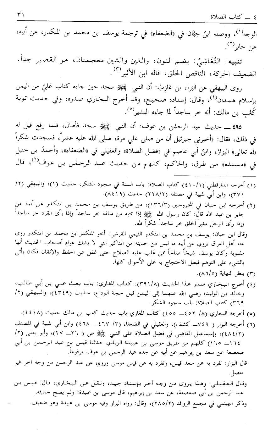 2 أخرجه ابن حبان في المجروحين "3/136"، من طريق يوسف بن محمد بن المنكدر عن أبيه عن جابر بن عبد الله قال: كان رسول الله صَلَّى اللَّهُ عَلَيْهِ وَسَلَّمَ إذا انتبه من منامه خر ساجداً وإذا رأى القرد خر ساجداً وإذا رأى الرجل مغير الخلق خر ساجداً شكراً لله.