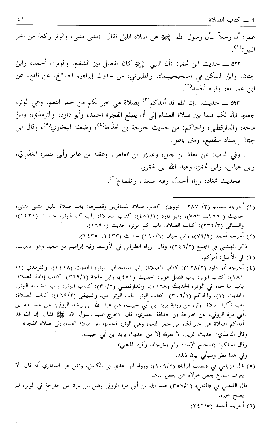 523 - حَدِيثُ "إنَّ اللَّهَ قَدْ أَمَدَّكُمْ3 بِصَلَاةٍ هِيَ خَيْرٌ لَكُمْ مِنْ حُمْرِ النَّعَمِ وَهِيَ الْوِتْرُ جَعَلَهَا اللَّهُ لَكُمْ فِيمَا بَيْنَ صَلَاةِ الْعِشَاءِ إلَى أَنْ يَطْلُعَ الْفَجْرُ" أَحْمَدُ وَأَبُو دَاوُد وَالتِّرْمِذِيُّ وَابْنُ مَاجَهْ وَالدَّارَقُطْنِيّ وَالْحَاكِمُ مِنْ حَدِيثِ خَارِجَةَ بْنِ حُذَافَةَ4 وَضَعَّفَهُ الْبُخَارِيُّ5 وَقَالَ ابْنُ حِبَّانَ إسناد مُنْقَطِعٌ وَمَتْنٌ بَاطِلٌ.