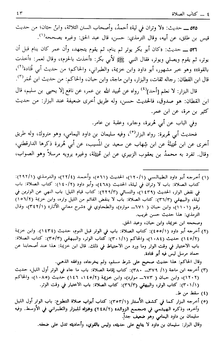 526 - حَدِيثُ كَانَ أَبُو بَكْرٍ يُوتِرُ ثُمَّ يَنَامُ ثُمَّ يَقُومُ يَتَهَجَّدُ وَأَنَّ عُمَرَ كَانَ يَنَامُ قَبْلَ أَنْ يُوتِرَ ثُمَّ يَقُومُ وَيُصَلِّي وَيُوتِرُ فَقَالَ النَّبِيُّ صَلَّى اللَّهُ عَلَيْهِ وَسَلَّمَ لِأَبِي بَكْرٍ "أَخَذْتَ بِالْحَزْمِ وَقَالَ لِعُمَرَ أَخَذْت بِالْقُوَّةِ" وَهُوَ خَبَرٌ مَشْهُورٌ أَبُو دَاوُد وَابْنُ خُزَيْمَةَ وَالطَّبَرَانِيُّ وَالْحَاكِمُ مِنْ حَدِيثِ أَبِي قَتَادَةَ2 قَالَ ابْنُ الْقَطَّانِ رِجَالُهُ ثِقَاتٌ وَالْبَزَّارُ وَابْنُ مَاجَهْ وَابْنُ حِبَّانَ وَالْحَاكِمُ مِنْ حَدِيثِ ابْنِ عُمَرَ3.