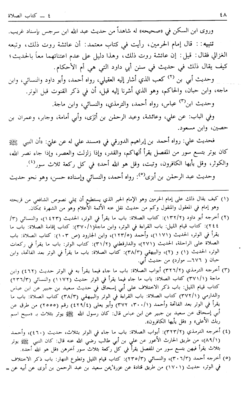 فَحَدِيثُ عَلِيٍّ رَوَاهُ أَحْمَدُ بْنُ إبْرَاهِيمَ الدَّوْرَقِيُّ فِي مُسْنَدِ عَلِيٍّ لَهُ عَنْ عَلِيٍّ أَنَّ النَّبِيَّ صَلَّى اللَّهُ عَلَيْهِ وَسَلَّمَ كَانَ يُوتِرُ بِتِسْعِ سُوَرٍ مِنْ الْمُفَصَّلِ يَقْرَأُ {أَلْهَاكُمْ} وَ {الْقَدْرِ} وَ {إذَا زُلْزِلَتْ} وَ {الْعَصْرِ} وَ {إذَا جَاءَ نَصْرُ اللَّهِ} وَالْكَوْثَرَ وَ {قُلْ يَا أَيُّهَا الْكَافِرُونَ} وَ {تَبَّتْ} وَ {قُلْ هُوَ اللَّهُ أَحَدٌ} فِي كُلِّ رَكْعَةٍ ثَلَاثُ سُوَرٍ.4.