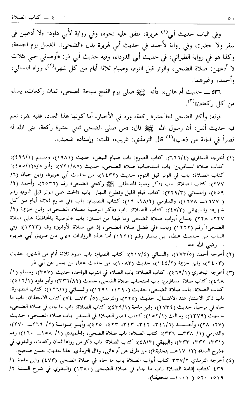 4 أخرجه الترمذي "2/337" كتاب أبواب الصلاة: باب ما جاء في صلاة الضحى "473" وابن ماجة "1/ 439" كتاب إقامة الصلاة: باب ما جاء في صلاة الضحى "1380" والبغوي في شرح السنة 2/519، 520 "1001- بتحقيقنا"