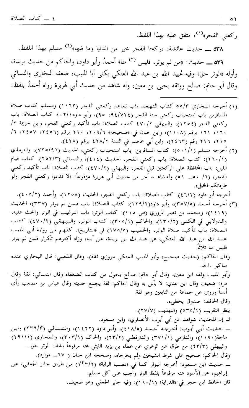 539 - حَدِيثُ "مَنْ لَمْ يُوتِرْ فَلَيْسَ3 مِنَّا" أَحْمَدُ وَأَبُو دَاوُد وَالْحَاكِمُ مِنْ حَدِيثِ بُرَيْدَةَ وَأَوَّلُهُ "الْوَتْرُ حَقٌّ" وَفِيهِ عُبَيْدُ اللَّهِ بْنُ عَبْدِ اللَّهِ الْعَتَكِيُّ يُكْنَى أَبَا الْمُنِيبِ ضَعَّفَهُ الْبُخَارِيُّ وَالنَّسَائِيُّ وَقَالَ أَبُو حَاتِمٍ صَالِحٌ وَوَثَّقَهُ يَحْيَى بْنُ مَعِينٍ وَلَهُ شَاهِدٌ مِنْ حَدِيثِ أَبِي هُرَيْرَةَ رَوَاهُ أَحْمَدُ بِلَفْظٍ: