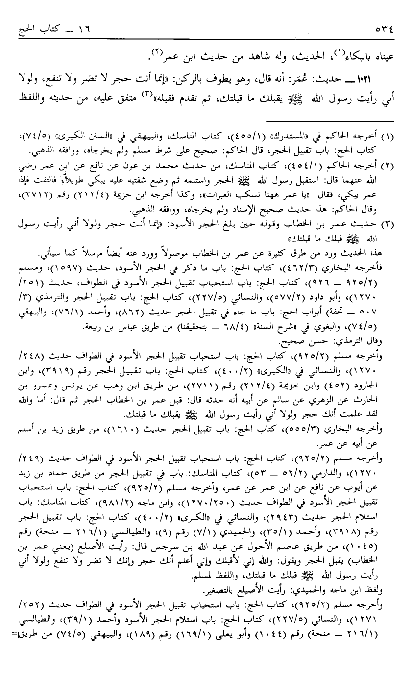 1021 - حَدِيثُ عُمَرَ أَنَّهُ قَالَ وَهُوَ يَطُوفُ بِالرُّكْنِ إنَّمَا أَنْتَ حَجَرٌ لَا تَضُرُّ وَلَا تَنْفَعُ وَلَوْلَا أَنِّي رَأَيْت رَسُولَ اللَّهِ صَلَّى اللَّهُ عَلَيْهِ وَسَلَّمَ يُقَبِّلُك مَا قَبَّلْتُك ثُمَّ تَقَدَّمَ فَقَبَّلَهُ3 مُتَّفَقٌ عَلَيْهِ مِنْ حَدِيثِهِ وَاللَّفْظُ