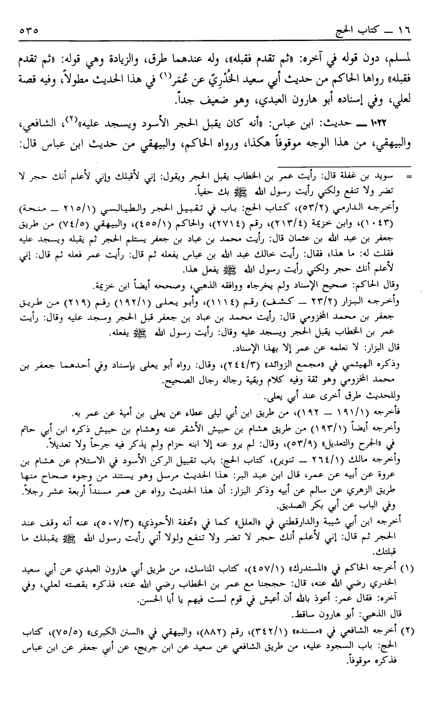 1022 - حَدِيثُ ابْنِ عَبَّاسٍ أَنَّهُ كَانَ يُقَبِّلُ الْحَجَرَ الْأَسْوَدَ وَيَسْجُدُ عَلَيْهِ2 الشَّافِعِيُّ وَالْبَيْهَقِيُّ مِنْ هَذَا الْوَجْهِ مَوْقُوفًا هَكَذَا وَرَوَاهُ الْحَاكِمُ وَالْبَيْهَقِيُّ مِنْ حَدِيثِ ابْنِ عَبَّاسٍ قَالَ: