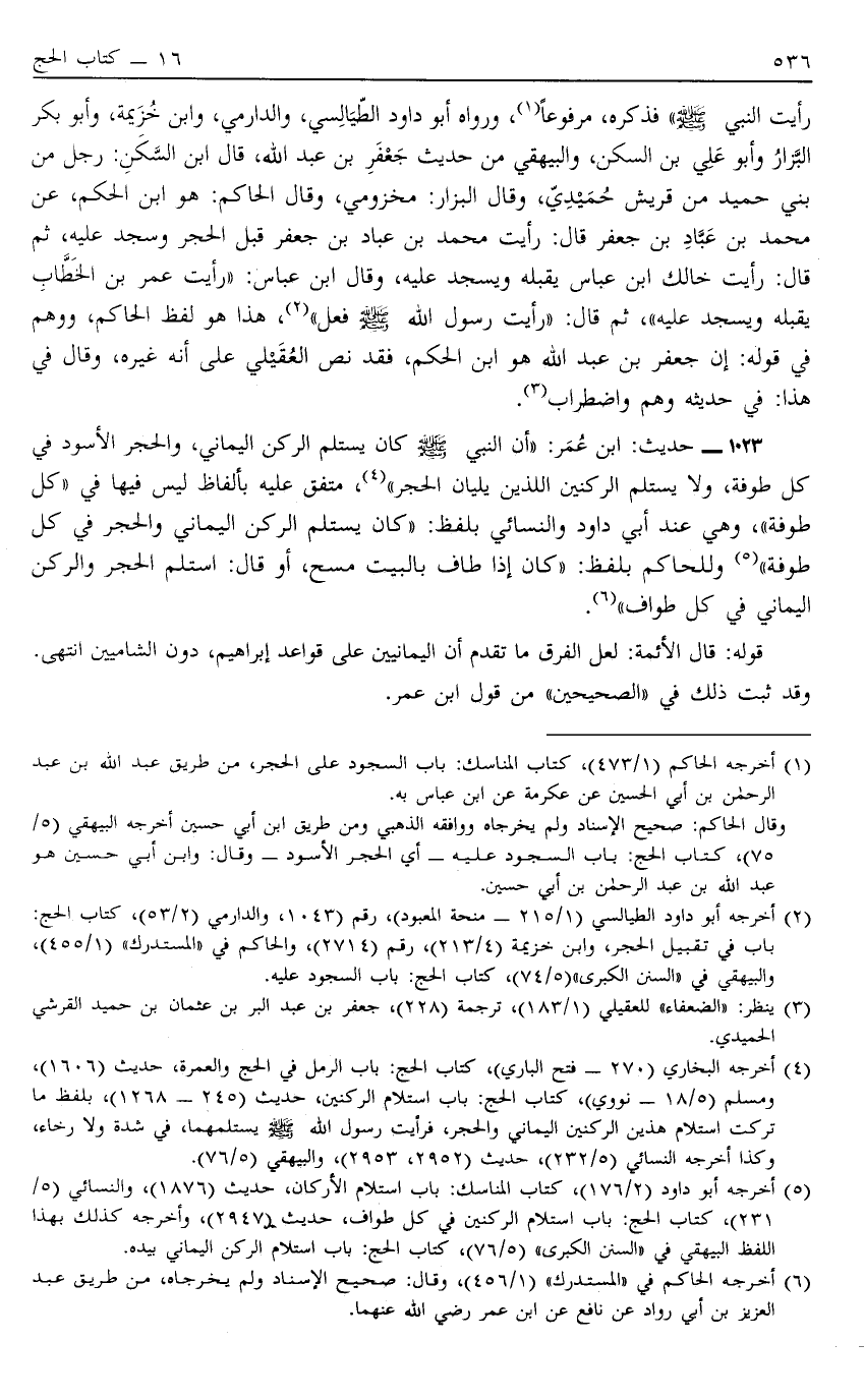 رَأَيْت النَّبِيَّ صَلَّى اللَّهُ عَلَيْهِ وَسَلَّمَ فَذَكَرَهُ مَرْفُوعًا1 وَرَوَاهُ أبو داود والطيالسي وَالدَّارِمِيُّ وَابْنُ خُزَيْمَةَ وَأَبُو بَكْرٍ الْبَزَّارُ وَأَبُو عَلِيِّ بْنُ السُّكْن وَالْبَيْهَقِيُّ مِنْ حَدِيثِ جَعْفَرِ بْنِ عَبْدِ اللَّهِ قَالَ ابْنُ السَّكَنِ رَجُلٌ مِنْ بَنِي حُمَيْدٍ مِنْ قُرَيْشٍ حُمَيْدِيٌّ وَقَالَ الْبَزَّارُ مَخْزُومِيٌّ وَقَالَ الْحَاكِمُ هُوَ ابْنُ الْحَكَمِ عَنْ مُحَمَّدِ بْنِ عَبَّادِ بْنِ جَعْفَرٍ قَالَ رَأَيْت مُحَمَّدَ بن عباد بْنَ جَعْفَرٍ قَبَّلَ الْحَجَرَ وَسَجَدَ عَلَيْهِ ثُمَّ قَالَ رَأَيْت خَالَك ابْنَ عَبَّاسٍ يُقَبِّلُهُ وَيَسْجُدُ عَلَيْهِ وَقَالَ ابْنُ عَبَّاسٍ رَأَيْت عُمَرَ بْنَ الْخَطَّابِ يُقَبِّلُهُ وَيَسْجُدُ عَلَيْهِ ثُمَّ قَالَ رَأَيْت رَسُولَ اللَّهِ صَلَّى اللَّهُ عَلَيْهِ وَسَلَّمَ فَعَلَ2 هَذَا هُوَ لَفْظُ الْحَاكِمِ وَوَهَمَ فِي قَوْلِهِ إنَّ جَعْفَرَ بْنَ عَبْدِ اللَّهِ هُوَ ابْنُ الْحَكَمِ فَقَدْ نَصَّ الْعُقَيْلِيُّ عَلَى أَنَّهُ غَيْرُهُ وَقَالَ فِي هَذَا فِي حَدِيثِهِ وَهْمٌ وَاضْطِرَابٌ3.