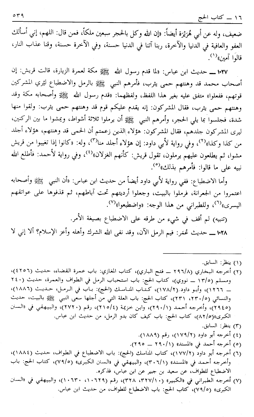 1027 - حَدِيثُ ابْنِ عَبَّاسٍ لَمَّا قَدِمَ رَسُولُ اللَّهِ صَلَّى اللَّهُ عَلَيْهِ وَسَلَّمَ مَكَّةَ لِعُمْرَةِ الزِّيَارَةِ قَالَتْ قُرَيْشٌ إنَّ أَصْحَابَ محمد قد وهنتم حُمَّى يَثْرِبَ فَأَمَرَهُمْ النَّبِيُّ صَلَّى اللَّهُ عَلَيْهِ وَسَلَّمَ بِالرَّمَلِ وَالِاضْطِبَاعِ لِيُرِيَ الْمُشْرِكِينَ قُوَّتَهُمْ فَفَعَلُوا مُتَّفَقٌ عَلَيْهِ بِغَيْرِ هَذَا اللَّفْظِ وَلَفْظُهُمَا قَدِمَ رَسُولُ اللَّهِ صَلَّى اللَّهُ عَلَيْهِ وَسَلَّمَ وَأَصْحَابُهُ مَكَّةَ وَقَدْ وَهَنَتْهُمْ حُمَّى يَثْرِبَ فَقَالَ الْمُشْرِكُونَ إنَّهُ يَقْدَمُ عَلَيْكُمْ قَوْمٌ قَدْ وَهَنَتْهُمْ حُمَّى يَثْرِبَ وَلَقُوا مِنْهَا شِدَّةً فَجَلَسُوا بِمَا يَلِي الْحَجَرَ وَأَمَرَهُمْ النَّبِيُّ صَلَّى اللَّهُ عَلَيْهِ وَسَلَّمَ أَنْ يَرْمُلُوا ثَلَاثَةَ أَشْوَاطٍ وَيَمْشُوا مَا بَيْنَ الرُّكْنَيْنِ لِيَرَى الْمُشْرِكُونَ جَلَدَهُمْ فَقَالَ الْمُشْرِكُونَ هَؤُلَاءِ الَّذِينَ زَعَمْتُمْ أَنَّ الْحُمَّى قَدْ وَهَنَتْهُمْ هَؤُلَاءِ أَجْلَدُ مِنْ كَذَا وَكَذَا2 وَفِي رِوَايَةٍ لِأَبِي دَاوُد إنَّ هَؤُلَاءِ أَجَلْدُ مِنَّا3 وَلَهُ كَانُوا إذَا تَغَيَّبُوا مِنْ قُرَيْشٍ مَشَوْا ثُمَّ يَطْلُعُونَ عَلَيْهِمْ يَرْمُلُونَ تَقُولُ قُرَيْشٌ كَأَنَّهُمْ الْغِزْلَانُ4 وَفِي رِوَايَةٍ لِأَحْمَدَ فَأَطْلَعَ اللَّهُ نَبِيَّهُ عَلَى مَا قَالُوا فَأَمَرَهُمْ بِذَلِكَ5.
