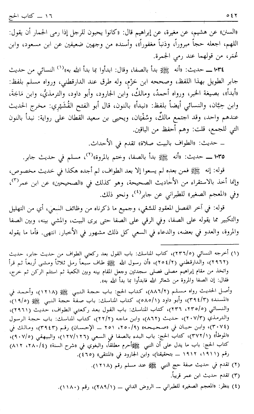 1034 - حَدِيثُ أَنَّهُ صَلَّى اللَّهُ عَلَيْهِ وَسَلَّمَ بَدَأَ بالصفا وقال ابدأوا بِمَا بَدَأَ اللَّهُ بِهِ1 النَّسَائِيُّ مِنْ حَدِيثِ جَابِرٍ الطَّوِيلِ بِهَذَا اللَّفْظِ وَصَحَّحَهُ ابْنُ حَزْمٍ وَلَهُ طُرُقٌ عِنْدَ الدَّارَقُطْنِيِّ وَرَوَاهُ مُسْلِمٌ بِلَفْظِ أَبْدَأُ بِصِيغَةِ الْخَبَرِ وَرَوَاهُ أَحْمَدُ وَمَالِكٌ وَابْنُ الْجَارُودِ وَأَبُو دَاوُد وَالتِّرْمِذِيُّ وَابْنُ مَاجَهْ وَابْنُ حِبَّانَ وَالنَّسَائِيُّ أَيْضًا بِلَفْظِ نَبْدَأُ بِالنُّونِ قَالَ أَبُو الْفَتْحِ الْقُشَيْرِيُّ مَخْرَجُ الْحَدِيثِ عِنْدَهُمْ وَاحِدٌ وَقَدْ اجْتَمَعَ مَالِكٌ وَسُفْيَانُ وَيَحْيَى بْنُ سَعِيدٍ الْقَطَّانِ عَلَى رِوَايَةِ نَبْدَأُ بِالنُّونِ الَّتِي لِلْجَمْعِ قُلْت وَهُمْ أَحْفَظُ مِنْ الْبَاقِينَ.