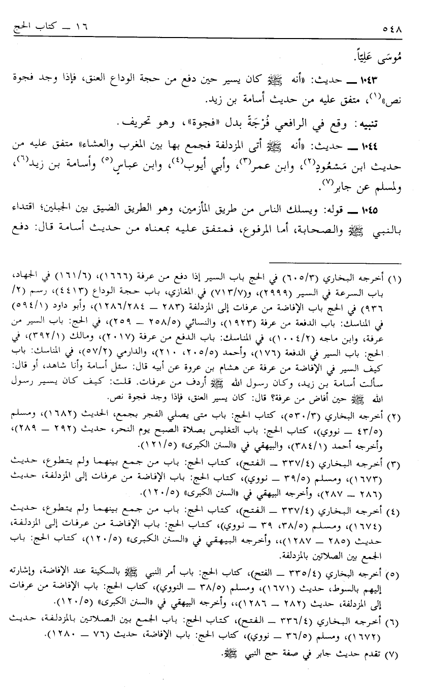 1043 - حَدِيثُ أَنَّهُ صَلَّى اللَّهُ عَلَيْهِ وَسَلَّمَ كَانَ يَسِيرُ حِينَ دَفَعَ مِنْ حَجَّةِ الْوَدَاعِ الْعَنَقَ فَإِذَا وَجَدَ فَجْوَةً نَصَّ1 مُتَّفَقٌ عَلَيْهِ مِنْ حَدِيثِ أُسَامَةَ بْنِ زَيْدٍ.