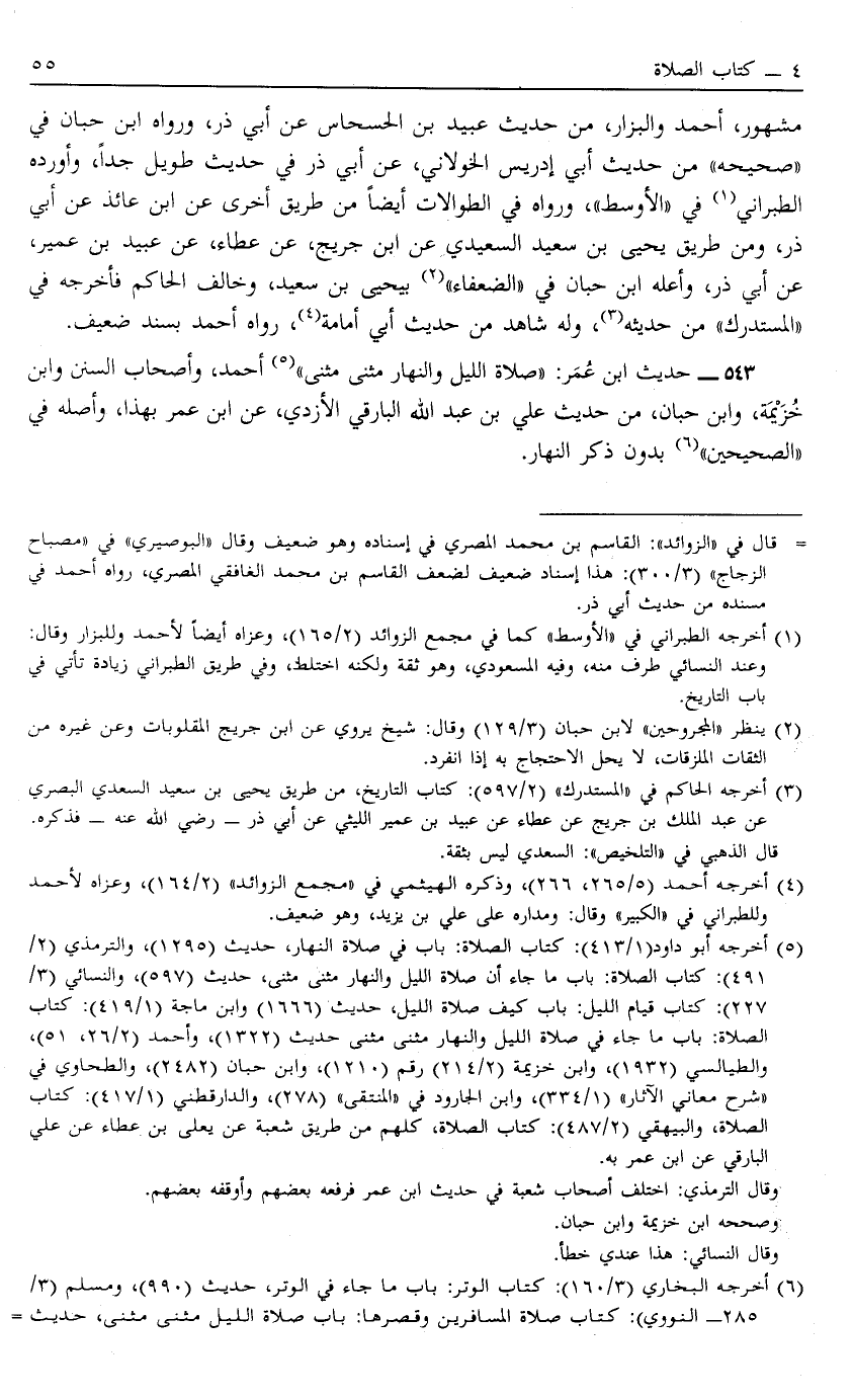 543 - حَدِيثُ ابْنِ عُمَرَ "صَلَاةُ اللَّيْلِ وَالنَّهَارِ مَثْنَى مَثْنَى"5 أَحْمَدُ وَأَصْحَابُ السُّنَنِ وَابْنُ خُزَيْمَةَ وَابْنُ حِبَّانَ مِنْ حَدِيثِ عَلِيِّ بْنِ عَبْدِ اللَّهِ الْبَارِقِيِّ الْأَزْدِيِّ عَنْ ابْنِ عُمَرَ بِهَذَا وَأَصْلُهُ فِي الصَّحِيحَيْنِ6 بِدُونِ ذِكْرِ النَّهَارِ.