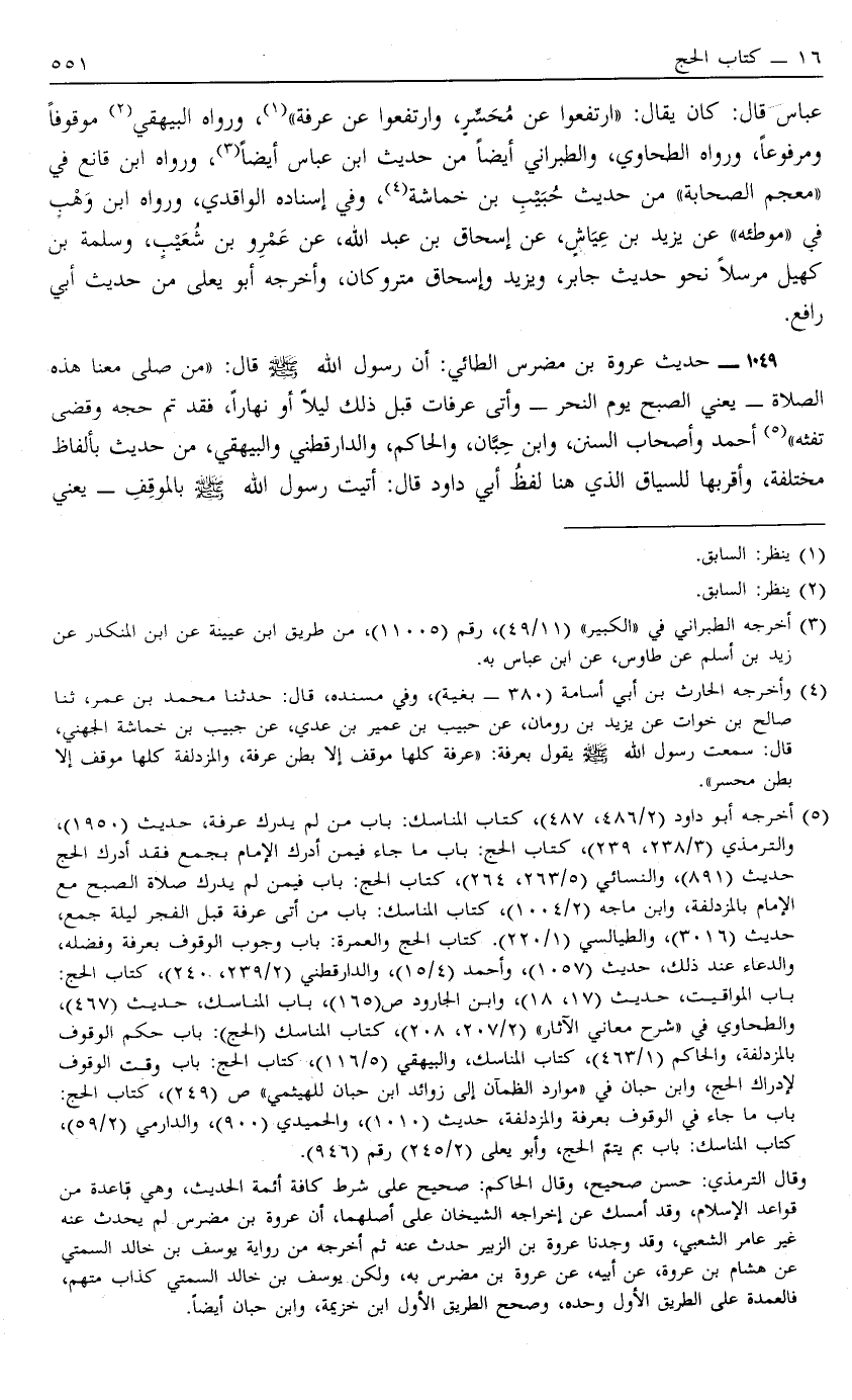 1049 - حَدِيثُ عُرْوَةَ بْنِ مُضَرِّسٍ الطَّائِيِّ أَنَّ رَسُولَ اللَّهِ صَلَّى اللَّهُ عَلَيْهِ وَسَلَّمَ قَالَ "مَنْ صَلَّى مَعَنَا هَذِهِ الصَّلَاةَ يَعْنِي الصُّبْحَ يَوْمَ النَّحْرِ وَأَتَى عَرَفَاتٍ قَبْلَ ذَلِكَ لَيْلًا أَوْ نَهَارًا فَقَدْ تَمَّ حَجُّهُ وَقَضَى تَفَثَهُ" 5 أَحْمَدُ وَأَصْحَابُ السُّنَنِ وَابْنُ حِبَّانَ وَالْحَاكِمُ وَالدَّارَقُطْنِيّ وَالْبَيْهَقِيُّ مِنْ حَدِيثِهِ بِأَلْفَاظٍ مُخْتَلِفَةٍ وَأَقْرَبُهَا لِلسِّيَاقِ الَّذِي هُنَا لَفْظُ أَبِي دَاوُد قَالَ أَتَيْت رَسُولَ اللَّهِ صَلَّى اللَّهُ عَلَيْهِ وَسَلَّمَ بِالْمَوْقِفِ يعني
