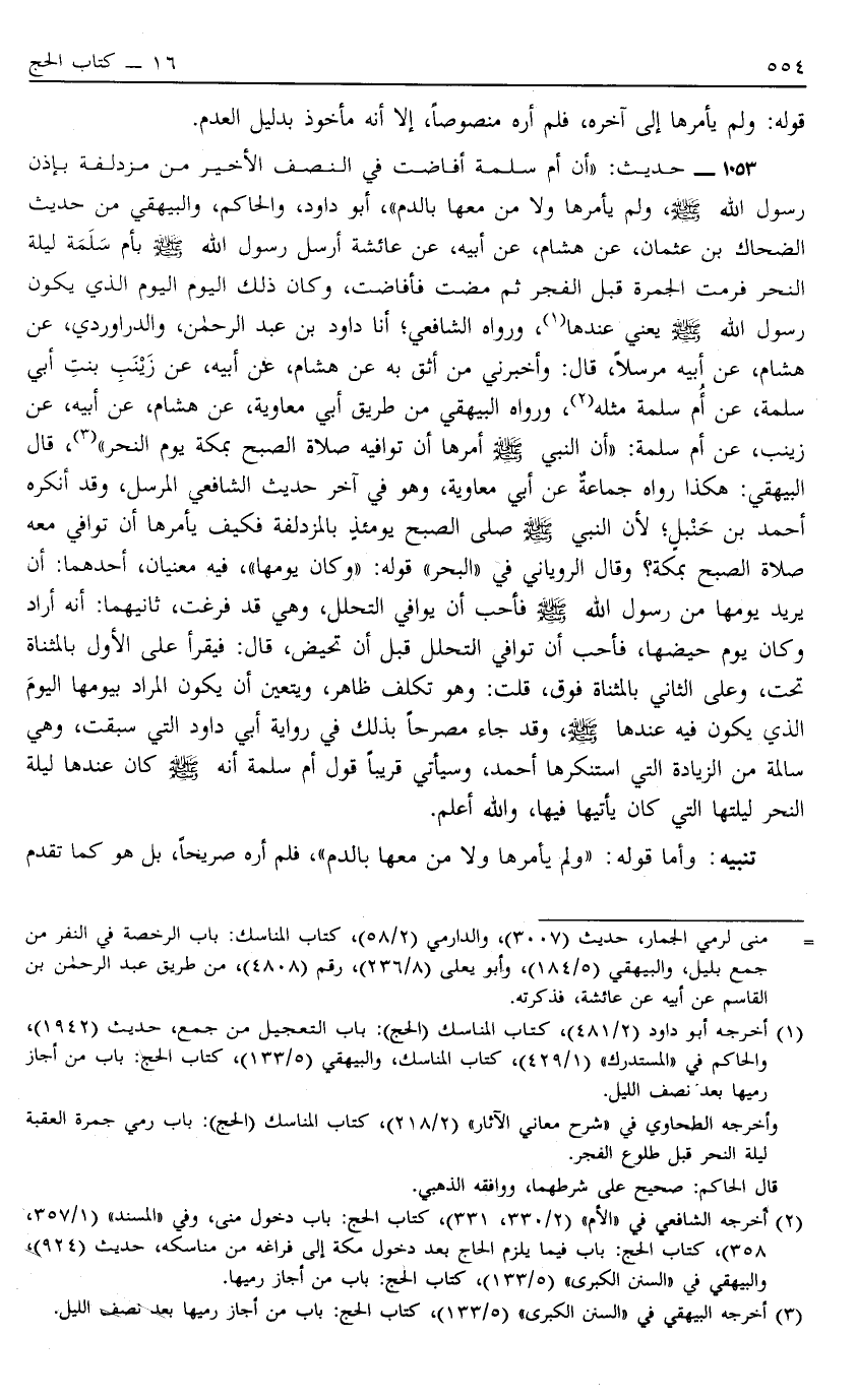 1053 - حَدِيثُ أَنَّ أُمَّ سَلَمَةَ أَفَاضَتْ فِي النِّصْفِ الْأَخِيرِ مِنْ مُزْدَلِفَةَ بِإِذْنِ رَسُولِ اللَّهِ صَلَّى اللَّهُ عَلَيْهِ وَسَلَّمَ وَلَمْ يَأْمُرْهَا وَلَا مَنْ مَعَهَا بِالدَّمِ أَبُو دَاوُد وَالْحَاكِمُ وَالْبَيْهَقِيُّ مِنْ حَدِيثِ الضَّحَّاكِ بْنِ عُثْمَانَ عَنْ هِشَامٍ عَنْ أَبِيهِ عَنْ عَائِشَةَ أَرْسَلَ رَسُولُ اللَّهِ صَلَّى اللَّهُ عَلَيْهِ وَسَلَّمَ بِأُمِّ سَلَمَةَ لَيْلَةَ النَّحْرِ فَرَمَتْ الْجَمْرَةَ قَبْلَ الْفَجْرِ ثُمَّ مَضَتْ فَأَفَاضَتْ وَكَانَ ذَلِكَ الْيَوْمُ الْيَوْمَ الَّذِي يَكُونُ رَسُولُ اللَّهِ صَلَّى اللَّهُ عَلَيْهِ وَسَلَّمَ يَعْنِي عِنْدَهَا1 وَرَوَاهُ الشَّافِعِيُّ أَنَا دَاوُد بْنُ عَبْدِ الرَّحْمَنِ والدراوردي عَنْ هِشَامٍ عَنْ أَبِيهِ مُرْسَلًا قَالَ وَأَخْبَرَنِي مَنْ أَثِقُ بِهِ عَنْ هِشَامٍ عَنْ أَبِيهِ عَنْ زَيْنَبَ بِنْتِ أَبِي سَلَمَةَ عَنْ أُمِّ سَلَمَةَ مِثْلَهُ2 وَرَوَاهُ الْبَيْهَقِيُّ مِنْ طَرِيقِ أَبِي مُعَاوِيَةَ عَنْ هِشَامٍ عَنْ أَبِيهِ عَنْ زَيْنَبَ عَنْ أُمِّ سَلَمَةَ أَنَّ النَّبِيَّ صَلَّى اللَّهُ عَلَيْهِ وَسَلَّمَ أَمَرَهَا أَنْ تُوَافِيَهُ صَلَاةَ الصُّبْحِ بِمَكَّةَ يَوْمَ النَّحْرِ3 قَالَ الْبَيْهَقِيّ هَكَذَا رَوَاهُ جَمَاعَةٌ عَنْ أَبِي مُعَاوِيَةَ وَهُوَ فِي آخِرِ حَدِيثِ الشَّافِعِيِّ الْمُرْسَلِ وَقَدْ أَنْكَرَهُ أَحْمَدُ بْنُ حَنْبَلٍ لِأَنَّ النَّبِيَّ صَلَّى اللَّهُ عَلَيْهِ وَسَلَّمَ صَلَّى الصُّبْحَ يَوْمئِذٍ بِالْمُزْدَلِفَةِ فَكَيْفَ يَأْمُرُهَا أَنْ تُوَافِيَ مَعَهُ صَلَاةَ الصُّبْحِ بِمَكَّةَ وَقَالَ الرُّويَانِيُّ فِي الْبَحْرِ قَوْلُهُ وَكَانَ يومها فيه مغنيان أَحَدُهُمَا أَنْ يُرِيدَ يَوْمَهَا مِنْ رَسُولِ اللَّهِ صَلَّى اللَّهُ عَلَيْهِ وَسَلَّمَ فَأَحَبَّ أَنْ يُوَافِيَ التَّحَلُّلَ وَهِيَ قَدْ فَرَغَتْ ثَانِيهِمَا أَنَّهُ أَرَادَ وَكَانَ يَوْمَ حَيْضِهَا فَأَحَبَّ أَنْ تُوَافِيَ التَّحَلُّلَ قَبْلَ أَنْ تَحِيضَ قَالَ فَيَقْرَأُ عَلَى الْأَوَّلِ بِالْمُثَنَّاةِ تَحْتَ وَعَلَى الثَّانِي بِالْمُثَنَّاةِ فَوْقَ قُلْت وَهُوَ تَكَلُّفٌ ظَاهِرٌ وَيَتَعَيَّنُ أَنْ يَكُونَ المراد بيومها الَّذِي يَكُونُ فِيهِ عِنْدَهَا صَلَّى اللَّهُ عَلَيْهِ وَسَلَّمَ وَقَدْ جَاءَ مُصَرَّحًا بِذَلِكَ فِي رِوَايَةِ أَبِي دَاوُد الَّتِي سَبَقَتْ وَهِيَ سَالِمَةٌ مِنْ الزِّيَادَةِ الَّتِي اسْتَنْكَرَهَا أَحْمَدُ وَسَيَأْتِي قَرِيبًا قَوْلُ أُمِّ سَلَمَةَ إنَّهُ صَلَّى اللَّهُ عَلَيْهِ وَسَلَّمَ كَانَ عِنْدَهَا لَيْلَةَ النَّحْرِ لَيْلَتَهَا التي كان يَأْتِيهَا فِيهَا وَاَللَّهُ أَعْلَمُ.