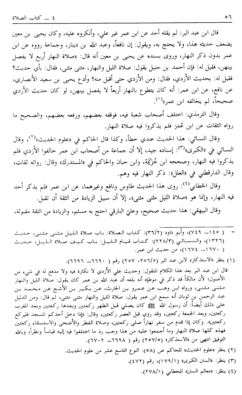 قَالَ ابْنُ عَبْدِ الْبَرِّ لَمْ يَقُلْهُ أَحَدٌ عَنْ ابْنِ عمر غير علي وأنكره عَلَيْهِ وَكَانَ يَحْيَى بْنُ مَعِينٍ يُضَعِّفُ حَدِيثَهُ هَذَا وَلَا يَحْتَجُّ بِهِ وَيَقُولُ إنَّ نَافِعًا وَعَبْدَ اللَّهِ بْنَ دِينَارٍ وَجَمَاعَةً رَوَوْهُ عَنْ ابْنِ عُمَرَ بِدُونِ ذِكْرِ النَّهَارِ وَرَوَى بِسَنَدِهِ عَنْ يَحْيَى بْنِ مَعِينٍ أَنَّهُ قَالَ صَلَاةُ النَّهَارِ أَرْبَعٌ لَا يُفْصَلُ بَيْنَهُنَّ فَقِيلَ لَهُ فَإِنَّ أَحْمَدَ بْنَ حَنْبَلٍ يَقُولُ صَلَاةُ اللَّيْلِ وَالنَّهَارِ مَثْنَى مَثْنَى فَقَالَ بِأَيِّ حَدِيثٍ فَقِيلَ لَهُ بِحَدِيثِ الْأَزْدِيِّ فَقَالَ وَمَنْ الْأَزْدِيُّ حَتَّى أَقْبَلَ مِنْهُ وَأَدَعَ يَحْيَى بْنُ سَعِيدٍ الْأَنْصَارِيُّ عَنْ نَافِعٍ عَنْ ابْنِ عُمَرَ أَنَّهُ كَانَ يَتَطَوَّعُ بِالنَّهَارِ أَرْبَعًا لَا يَفْصِلُ بَيْنَهُنَّ لَوْ كَانَ حَدِيثُ الْأَزْدِيِّ صَحِيحًا لَمْ يُخَالِفْهُ ابْنُ عُمَرَ1.