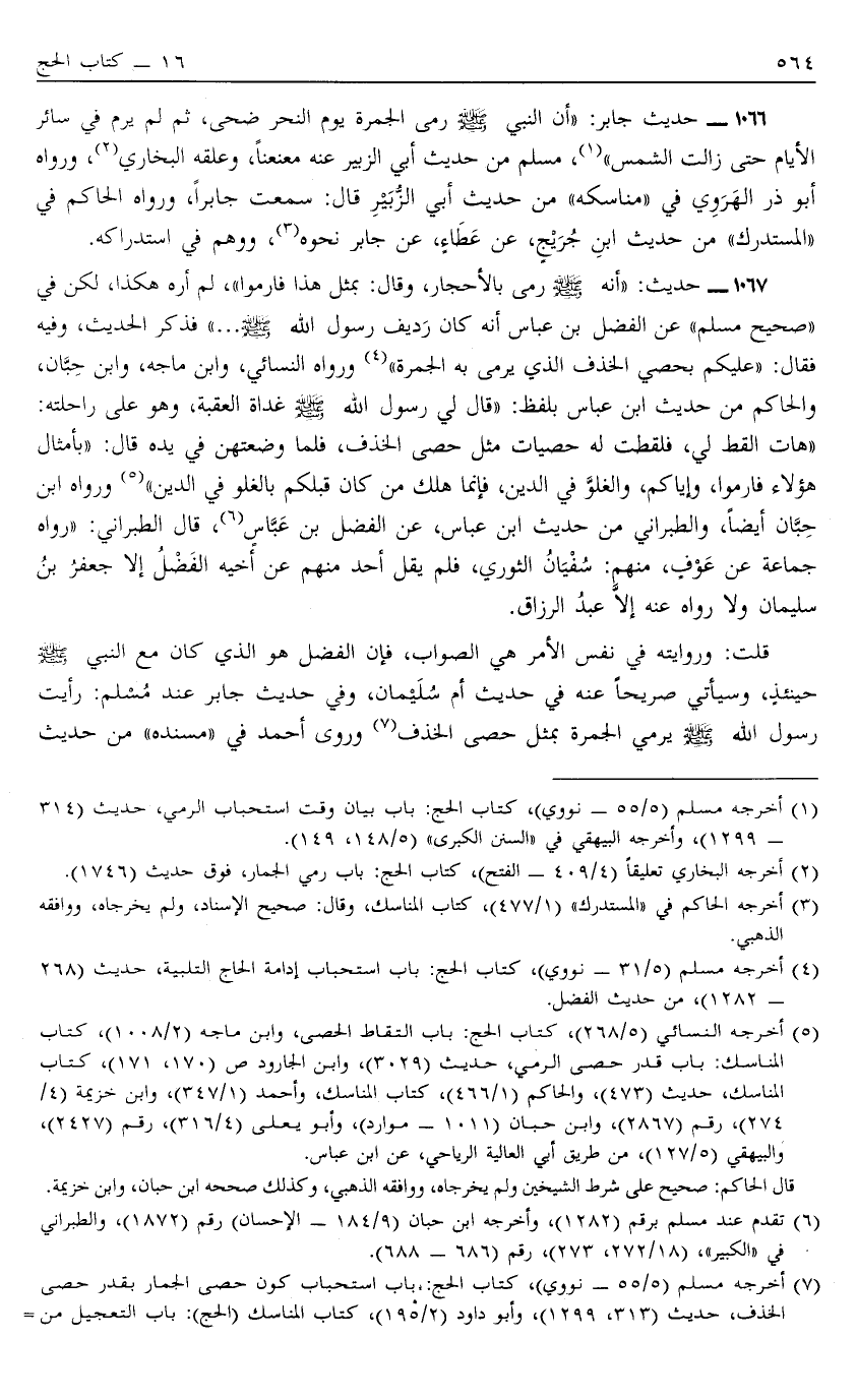 1066 - حَدِيثُ جَابِرٍ أَنَّ النَّبِيَّ صَلَّى اللَّهُ عَلَيْهِ وَسَلَّمَ رَمَى الْجَمْرَةَ يَوْمَ النَّحْرِ ضُحًى ثُمَّ لَمْ يَرْمِ فِي سَائِرِ الْأَيَّامِ حَتَّى زَالَتْ الشَّمْسُ1 مُسْلِمٌ مِنْ حَدِيثِ أَبِي الزُّبَيْرِ عَنْهُ مُعَنْعَنًا وَعَلَّقَهُ الْبُخَارِيُّ2 وَرَوَاهُ أَبُو ذَرٍّ الْهَرَوِيُّ فِي مَنَاسِكِهِ مِنْ حَدِيثِ أَبِي الزُّبَيْرِ قَالَ سَمِعْت جَابِرًا وَرَوَاهُ الْحَاكِمُ فِي الْمُسْتَدْرَكِ مِنْ حَدِيثِ ابْنِ جُرَيْجٍ عَنْ عَطَاءٍ عَنْ جَابِرٍ نَحْوَهُ3 وَوَهَمَ فِي اسْتِدْرَاكِهِ.