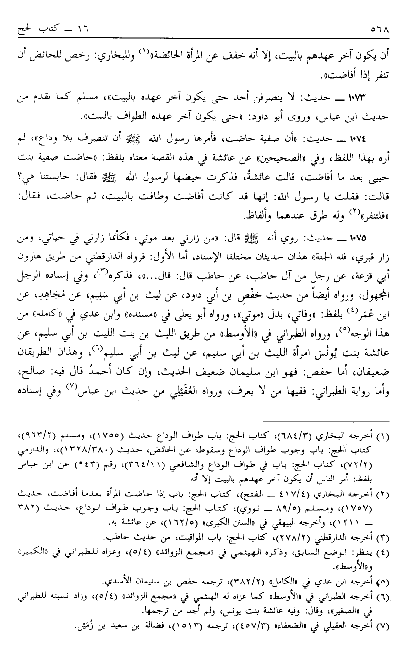 1073 - حَدِيثُ "لَا يَنْصَرِفَنَّ أَحَدٌ حَتَّى يَكُونَ آخِرُ عَهْدِهِ بِالْبَيْتِ" مُسْلِمٌ كَمَا تَقَدَّمَ مِنْ حَدِيثِ ابْنِ عَبَّاسٍ وَرَوَى أَبُو دَاوُد حَتَّى يَكُونَ آخِرُ عَهْدِهِ الطَّوَافَ بِالْبَيْتِ.