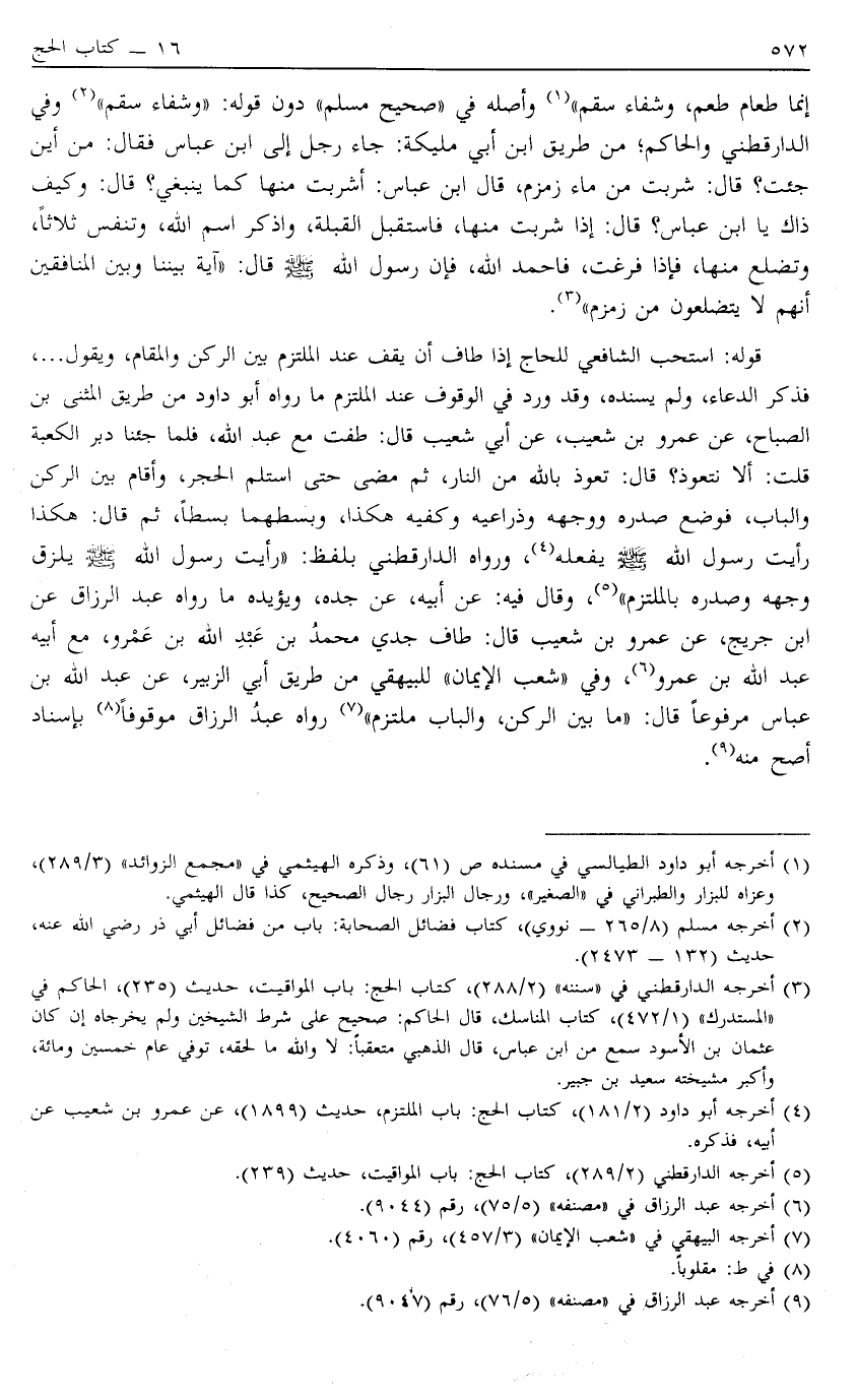 قَوْلُهُ اسْتَحَبَّ الشَّافِعِيُّ لِلْحَاجِّ إذَا طَافَ أَنْ يَقِفَ عِنْدَ الْمُلْتَزَمِ بَيْنَ الرُّكْنِ وَالْمَقَامِ وَيَقُولَ فَذَكَرَ الدُّعَاءَ وَلَمْ يُسْنِدْهُ وَقَدْ وَرَدَ فِي الْوُقُوفِ عِنْدَ الْمُلْتَزَمِ مَا رَوَاهُ أَبُو دَاوُد مِنْ طَرِيقِ الْمُثَنَّى بْنِ الصَّبَّاحِ عَنْ عَمْرِو بْنِ شُعَيْبٍ عَنْ أَبِيهِ شُعَيْبٍ قَالَ طُفْت مَعَ عَبْدِ اللَّهِ فَلَمَّا جِئْنَا دُبُرَ الْكَعْبَةِ قُلْت أَلَا نَتَعَوَّذُ قَالَ تَعَوَّذْ بِاَللَّهِ مِنْ النَّارِ ثُمَّ مَضَى حَتَّى اسْتَلَمَ الْحَجَرَ وَأَقَامَ بَيْنَ الرُّكْنِ وَالْبَابِ فَوَضَعَ صَدْرَهُ وَوَجْهَهُ وَذِرَاعَيْهِ وَكَفَّيْهِ هَكَذَا وَبَسَطَهُمَا بَسْطًا ثُمَّ قَالَ هَكَذَا رَأَيْت رَسُولَ اللَّهِ صَلَّى اللَّهُ عَلَيْهِ وَسَلَّمَ يَفْعَلُهُ4 وَرَوَاهُ الدَّارَقُطْنِيُّ بِلَفْظِ رَأَيْت رَسُولَ اللَّهِ صَلَّى اللَّهُ عَلَيْهِ وَسَلَّمَ يُلْزِقُ وَجْهَهُ وَصَدْرَهُ بِالْمُلْتَزَمِ5 وَقَالَ فِيهِ عَنْ أَبِيهِ عَنْ جَدِّهِ وَيُؤَيِّدُهُ مَا رَوَاهُ عَبْدُ الرَّزَّاقِ عَنْ ابْنِ جُرَيْجٍ عَنْ عَمْرِو بْنِ شُعَيْبٍ قَالَ طَافَ جَدِّي مُحَمَّدُ بْنُ عَبْدِ اللَّهِ بْنِ عَمْرٍو مَعَ أَبِيهِ عَبْدِ اللَّهِ بْنِ عَمْرٍو6 وَفِي شُعَبِ الْإِيمَانِ لِلْبَيْهَقِيِّ مِنْ طَرِيقِ أَبِي الزُّبَيْرِ عَنْ عَبْدِ اللَّهِ بْنِ عَبَّاس مَرْفُوعًا قال مَا بَيْنَ الرُّكْنِ وَالْبَابِ مُلْتَزَمٌ7 وَرَوَاهُ عَبْدُ الرَّزَّاقِ مَقْلُوبًا8 بِإِسْنَادٍ أَصَحَّ مِنْهُ9.