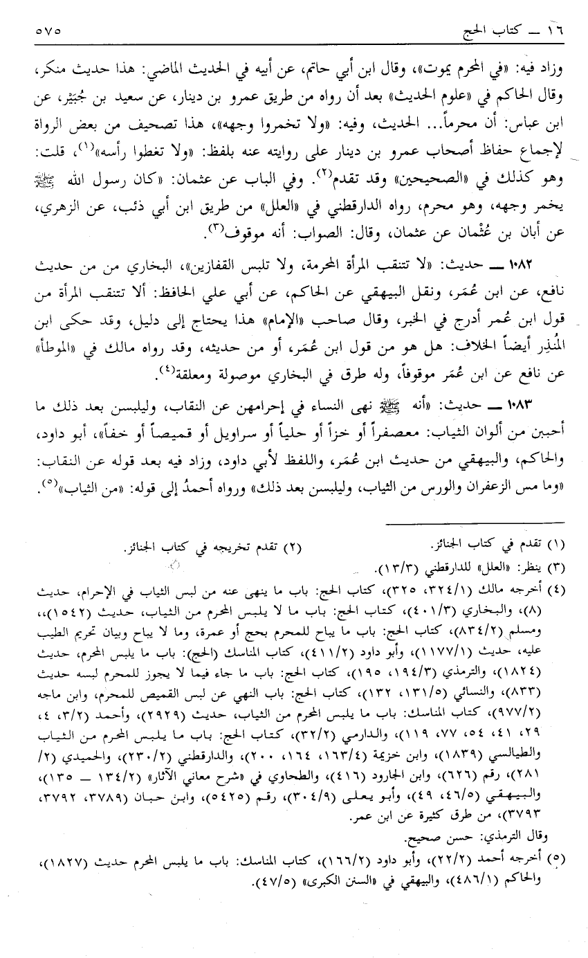 1082 - حديث "لا تتنقب الْمَرْأَةُ الْمُحْرِمَةُ وَلَا تَلْبَسْ الْقُفَّازَيْنِ" الْبُخَارِيُّ مِنْ حَدِيثِ نَافِعٍ عَنْ ابْنِ عُمَرَ وَنَقَلَ الْبَيْهَقِيُّ عَنْ الْحَاكِمِ عَنْ أَبِي عَلِيٍّ الْحَافِظِ أن "لا تتنقب الْمَرْأَةُ" مِنْ قَوْلِ ابْنِ عُمَرَ أُدْرِجَ فِي الْخَبَرِ وقال صاحب الإمام هَذَا يَحْتَاجُ إلَى دَلِيلٍ وَقَدْ حَكَى ابْنُ الْمُنْذِرِ أَيْضًا الْخِلَافَ هَلْ هُوَ مِنْ قَوْلِ ابْنِ عُمَرَ أَوْ مِنْ حَدِيثِهِ وَقَدْ رَوَاهُ مَالِكٌ فِي الْمُوَطَّأِ عَنْ نَافِعٍ عَنْ ابْنِ عُمَرَ مَوْقُوفًا وَلَهُ طُرُقٌ فِي الْبُخَارِيِّ مَوْصُولَةٌ وَمُعَلَّقَةٌ4.