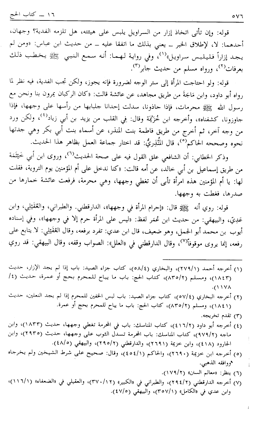 قَوْلُهُ رُوِيَ أَنَّهُ صَلَّى اللَّهُ عَلَيْهِ وَسَلَّمَ قَالَ "إحْرَامُ الْمَرْأَةِ فِي وَجْهِهَا" الدَّارَقُطْنِيُّ وَالطَّبَرَانِيُّ وَالْعُقَيْلِيُّ وَابْنُ عَدِيٍّ وَالْبَيْهَقِيُّ مِنْ حَدِيثِ ابْنِ عُمَرَ لفظ "لَيْسَ عَلَى الْمَرْأَةِ حَرَمٌ إلَّا فِي وَجْهِهَا" وَفِي إسْنَادِهِ أَيُّوبُ بْنُ مُحَمَّدٍ أَبُو الْجَمَلِ وَهُوَ ضَعِيفٌ قَالَ ابْنُ عَدِيٍّ تَفَرَّدَ بِرَفْعِهِ وَقَالَ الْعُقَيْلِيُّ لَا يُتَابَعُ عَلَى رَفْعِهِ إنَّمَا يُرْوَى مَوْقُوفًا7 وَقَالَ الدَّارَقُطْنِيُّ فِي الْعِلَلِ الصَّوَابُ وَقْفُهُ وَقَالَ الْبَيْهَقِيُّ قَدْ رُوِيَ
