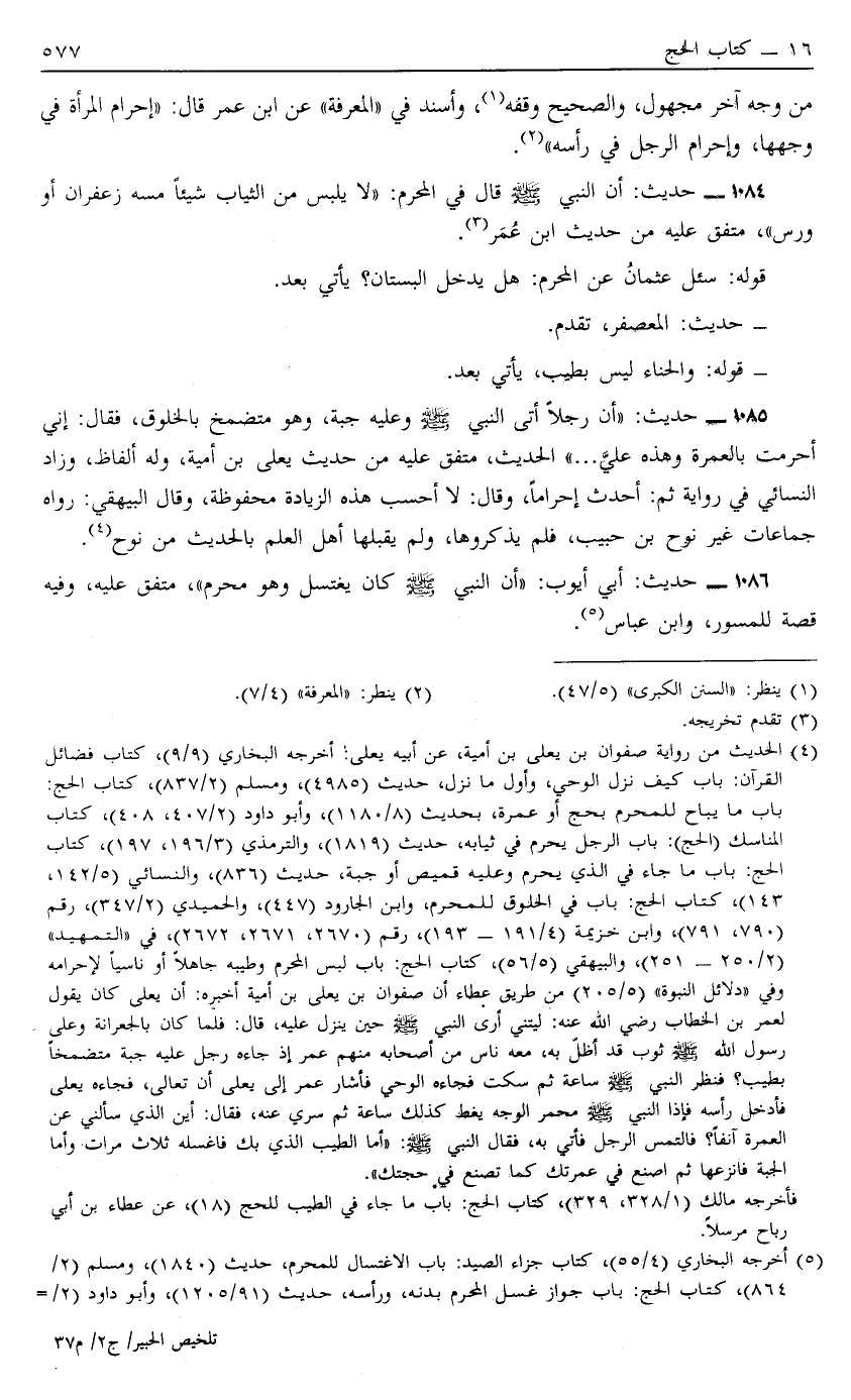 1085 - حَدِيثُ أَنَّ رَجُلًا أَتَى النَّبِيَّ صَلَّى اللَّهُ عَلَيْهِ وَسَلَّمَ وَعَلَيْهِ جُبَّةٌ وَهُوَ مُتَضَمِّخٌ بِالْخُلُوقِ فَقَالَ إنِّي أَحْرَمْت بِالْعُمْرَةِ وَهَذِهِ عَلَيَّ الْحَدِيثُ مُتَّفَقٌ عَلَيْهِ مِنْ حَدِيثِ يَعْلَى بْنِ أُمَيَّةَ وَلَهُ أَلْفَاظٌ وَزَادَ النَّسَائِيُّ فِي رِوَايَةٍ ثُمَّ أَحْدَثَ إحْرَامًا وَقَالَ لَا أَحْسَبُ هَذِهِ الزِّيَادَةَ مَحْفُوظَةً وَقَالَ الْبَيْهَقِيُّ رَوَاهُ جَمَاعَاتٌ غَيْرُ نُوحِ بْنِ حَبِيبٍ فَلَمْ يَذْكُرُوهَا وَلَمْ يَقْبَلْهَا أَهْلُ الْعِلْمِ بِالْحَدِيثِ مِنْ نُوحٍ4.