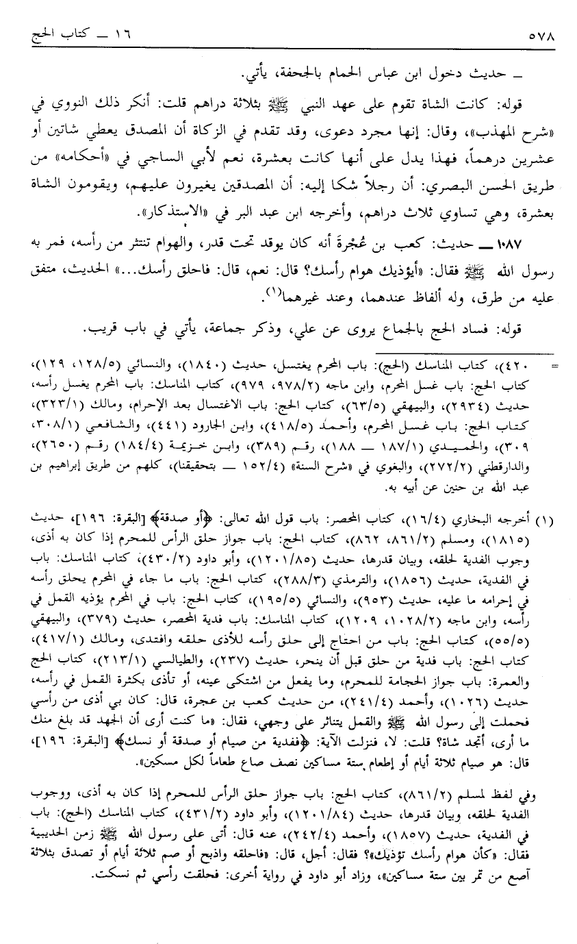 1087 - حَدِيثُ كَعْبِ بْنِ عُجْرَةَ أَنَّهُ كَانَ يُوقِدُ تَحْتَ قِدْرٍ وَالْهَوَامُّ تَنْتَثِرُ مِنْ رَأْسِهِ فَمَرَّ بِهِ رَسُولُ اللَّهِ صَلَّى اللَّهُ عَلَيْهِ وَسَلَّمَ فَقَالَ "أيؤذيك هَوَامُّ رَأْسِك" قَالَ نَعَمْ قَالَ "فَاحْلِقْ رَأْسَك" الْحَدِيثُ مُتَّفَقٌ عَلَيْهِ مِنْ طُرُقٍ وَلَهُ أَلْفَاظٌ عِنْدَهُمَا وَعِنْدَ غَيْرِهِمَا1.