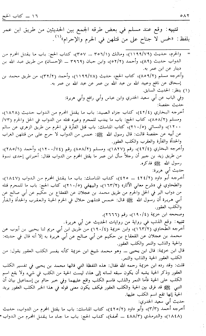 تَنْبِيهٌ: وَقَعَ عِنْدَ مُسْلِمٍ فِي بَعْضِ طُرُقِهِ الْجَمْعُ بَيْنَ الْحَدِيثَيْنِ مِنْ طَرِيقِ ابْنِ عُمَرَ بِلَفْظِ "خَمْسٌ لَا جُنَاحَ عَلَى مَنْ قَتَلَهُنَّ فِي الْحَرَمِ وَالْإِحْرَامِ" 1.