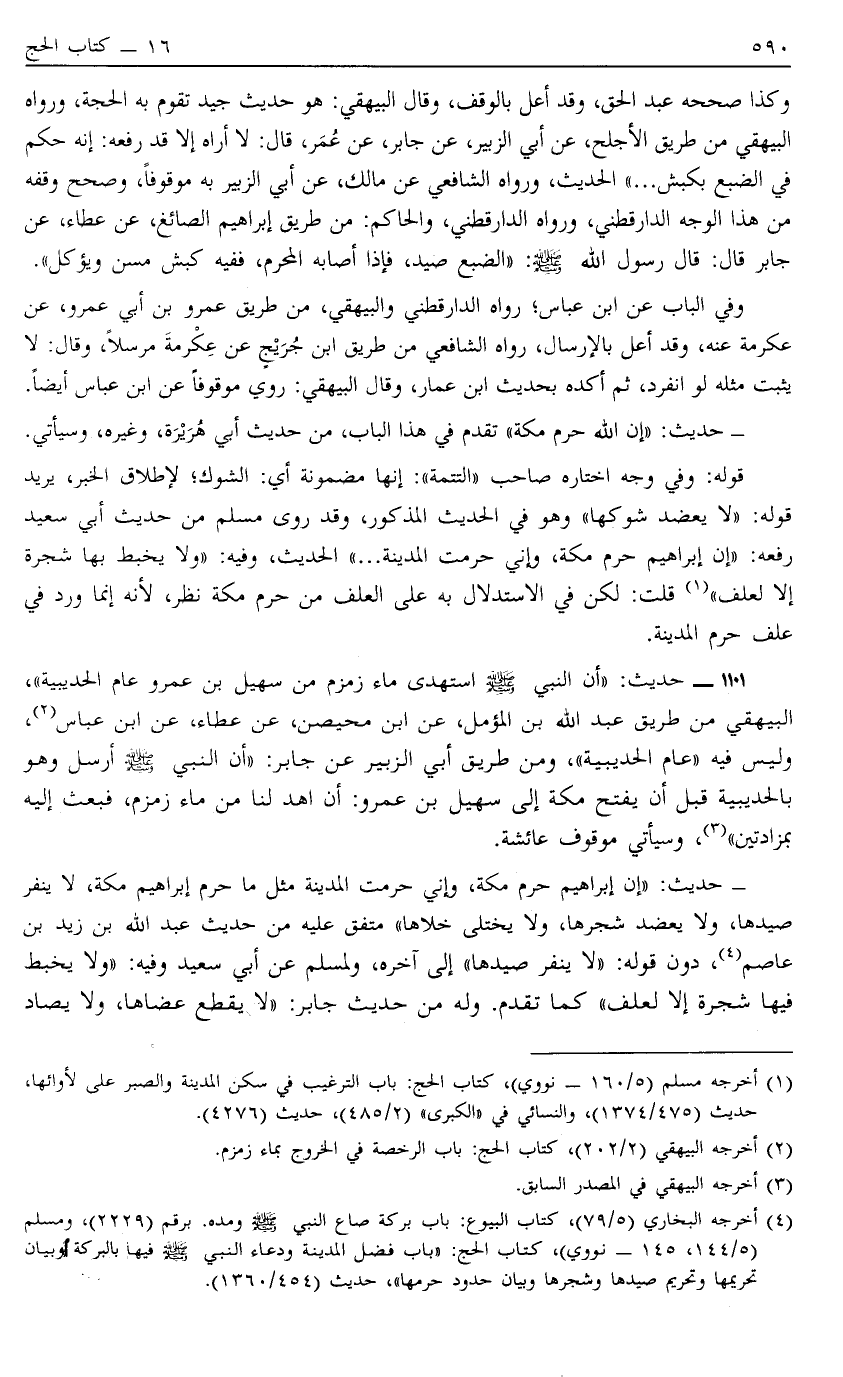 حَدِيثُ "إنَّ إبْرَاهِيمَ حَرَّمَ مَكَّةَ وَإِنِّي حَرَّمْت الْمَدِينَةَ مِثْلَ مَا حَرَّمَ إبْرَاهِيمُ مَكَّةَ لَا يُنَفَّرُ صَيْدُهَا وَلَا يُعَضَّدُ شَجَرُهَا وَلَا يُخْتَلَى خَلَاهَا" مُتَّفَقٌ عَلَيْهِ مِنْ حَدِيثِ عَبْدِ اللَّهِ بْنِ زَيْدِ بْنِ عَاصِمٍ4 دُونَ قَوْلِهِ "لَا يُنَفَّرُ صَيْدُهَا" إلَى آخِرِهِ وَلِمُسْلِمٍ عَنْ أَبِي سَعِيدٍ وَفِيهِ "وَلَا يُخْبَطُ فِيهَا شَجَرَةٌ إلَّا لِعَلَفٍ" كَمَا تَقَدَّمَ وَلَهُ مِنْ حَدِيثِ جَابِرٍ "لَا يُقْطَعُ عِضَاهُهَا وَلَا يُصَادُ