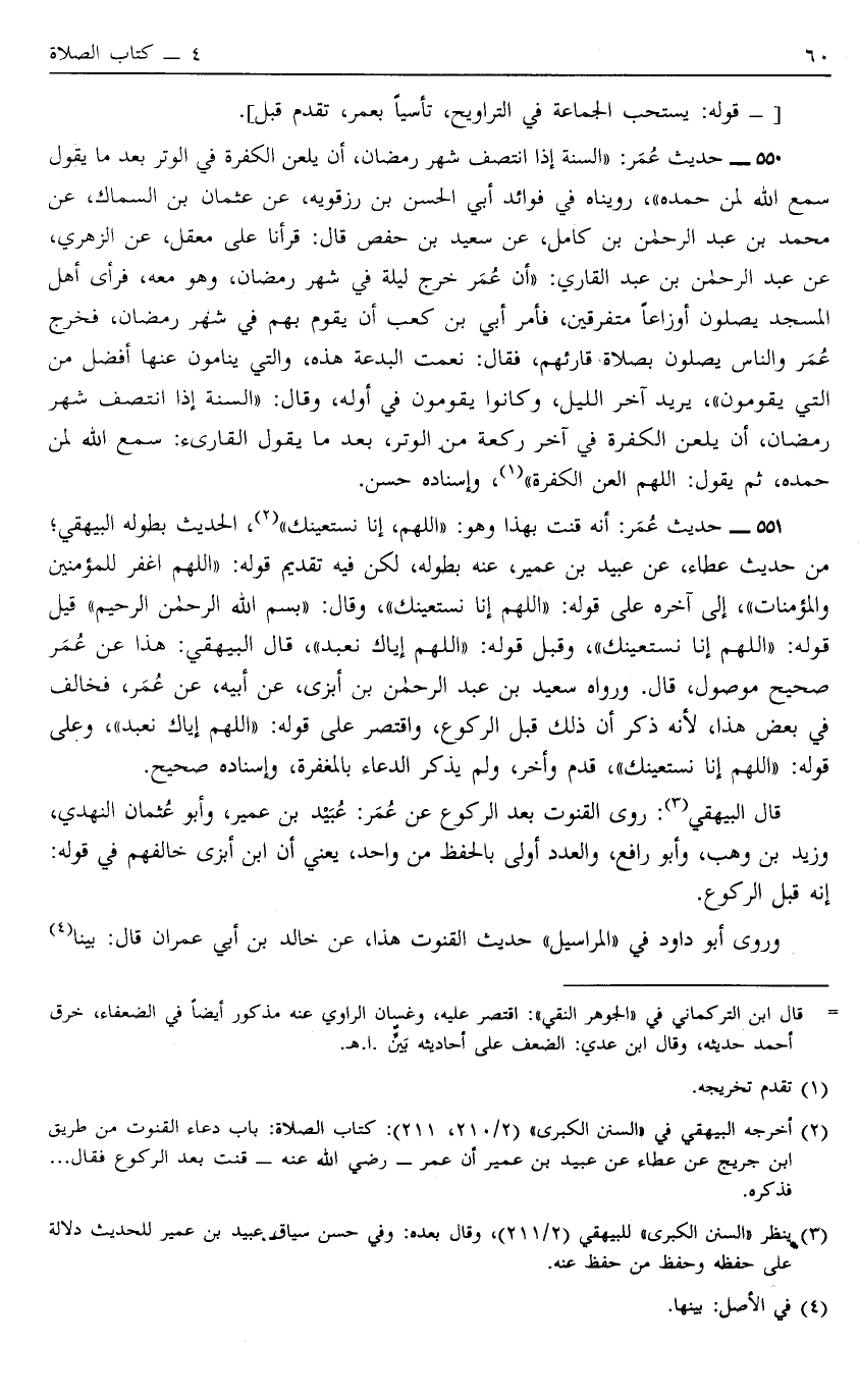 550 - حَدِيثُ عُمَرَ السُّنَّةُ إذَا انْتَصَفَ شَهْرُ رَمَضَانَ أَنْ يعلن الْكَفَرَةُ فِي الْوِتْرِ بَعْدَ مَا يَقُولُ سَمِعَ اللَّهُ لِمَنْ حَمِدَهُ رَوَيْنَاهُ فِي فَوَائِدِ أَبِي الْحَسَنِ بْنِ رِزْقَوَيْهِ عَنْ عُثْمَانَ بْنِ السِّمَاكِ عَنْ مُحَمَّدِ بْنِ عَبْدِ الرَّحْمَنِ بْنِ كَامِلٍ عَنْ سَعِيدِ بْنِ حَفْصٍ قَالَ قَرَأْنَا عَلَى مَعْقِلٍ عَنْ الزُّهْرِيِّ عَنْ عَبْدِ الرَّحْمَنِ بْنِ عَبْدِ الْقَارِيّ أَنَّ عُمَرَ خَرَجَ لَيْلَةً فِي شَهْرِ رَمَضَانَ وَهُوَ مَعَهُ فَرَأَى أَهْلَ الْمَسْجِدِ يصلون أوزاعا متفرقين فأمر أُبَيَّ بْنَ كَعْبٍ أَنْ يَقُومَ بِهِمْ فِي شَهْرِ رَمَضَانَ فَخَرَجَ عُمَرُ وَالنَّاسُ يُصَلُّونَ بِصَلَاةِ قَارِئِهِمْ فَقَالَ نِعْمَتْ الْبِدْعَةُ هَذِهِ وَاَلَّتِي يَنَامُونَ عَنْهَا أَفْضَلُ مِنْ الَّتِي يَقُومُونَ يُرِيدُ آخِرَ اللَّيْلِ وَكَانُوا يَقُومُونَ فِي أَوَّلِهِ وَقَالَ السُّنَّةُ إذَا انْتَصَفَ شَهْرُ رَمَضَانَ أَنْ يعلن الْكَفَرَةُ فِي آخِرِ رَكْعَةٍ مِنْ الْوِتْرِ بَعْدَ مَا يَقُولُ الْقَارِئُ سَمِعَ اللَّهُ لِمَنْ حَمِدَهُ ثُمَّ يَقُولُ اللَّهُمَّ الْعَنْ الْكَفَرَةَ1 وَإِسْنَادُهُ حَسَنٌ.