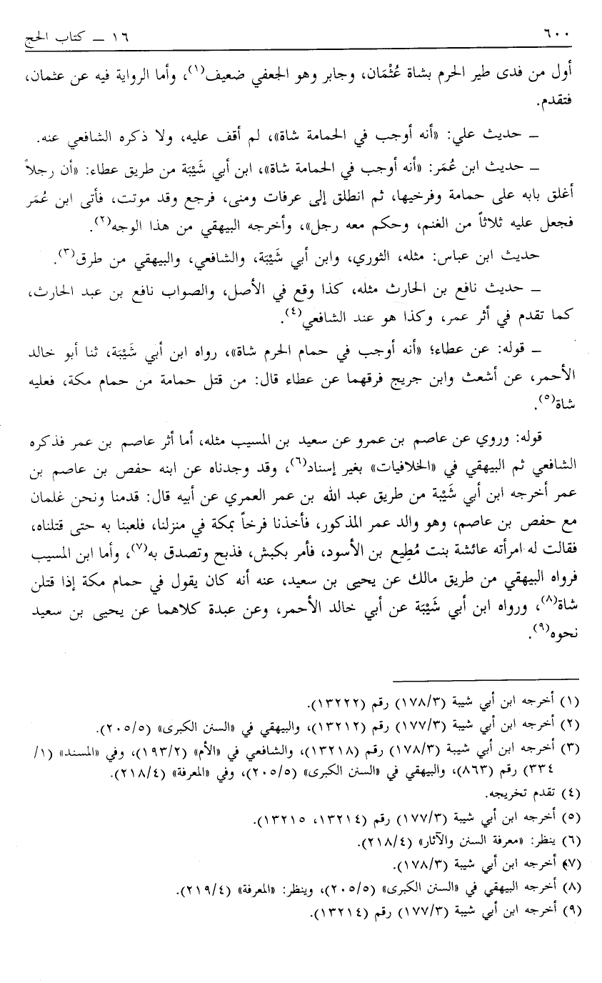 حَدِيثُ عَلِيٍّ أَنَّهُ أَوْجَبَ فِي الْحَمَامَةِ شَاةً لَمْ أَقِفْ عَلَيْهِ وَلَا ذَكَرَهُ الشَّافِعِيُّ عَنْهُ.