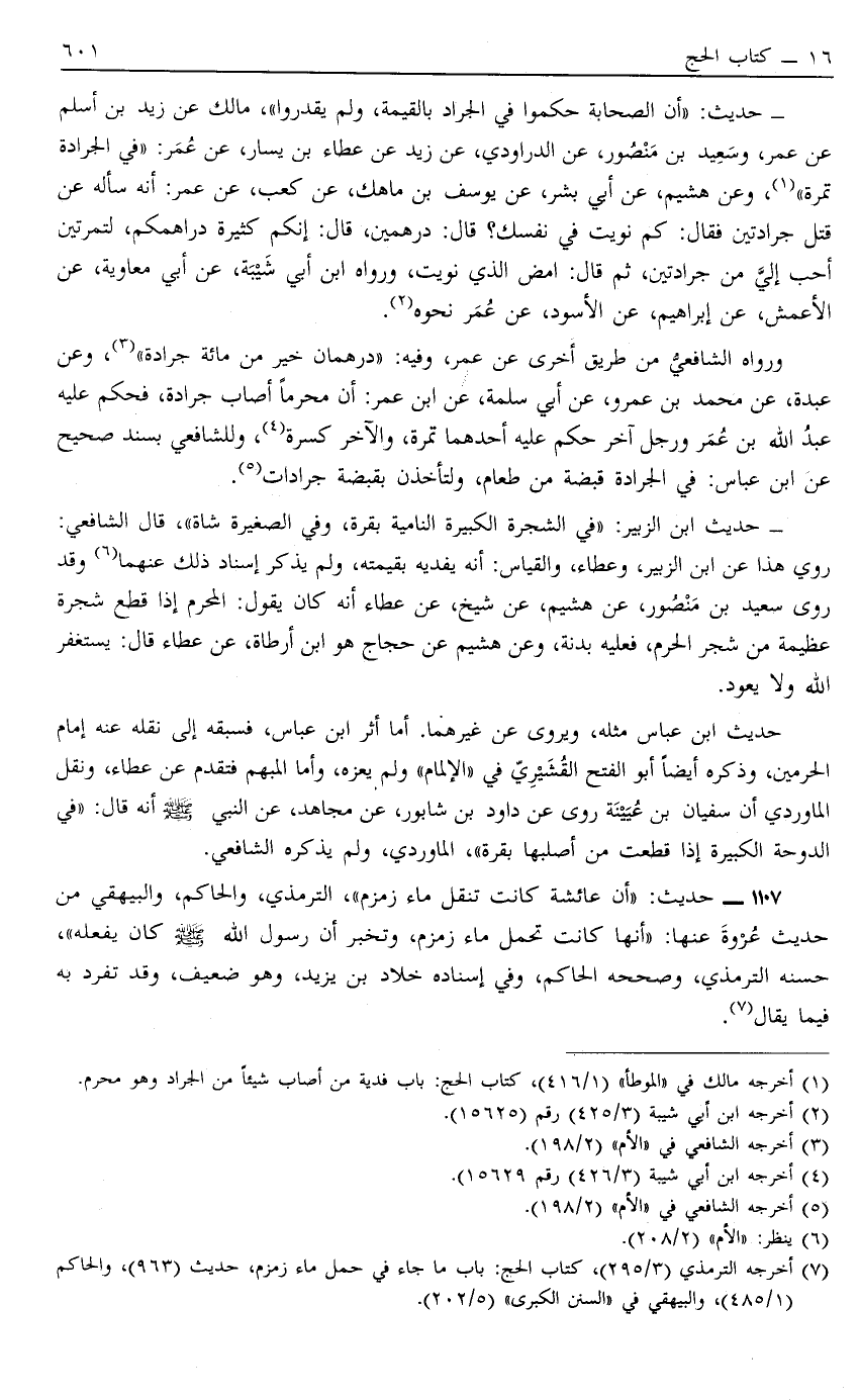 حَدِيثُ أَنَّ الصَّحَابَةَ حَكَمُوا فِي الْجَرَادِ بِالْقِيمَةِ وَلَمْ يُقَدِّرُوا مَالِكٌ عَنْ زَيْدِ بْنِ أَسْلَمَ عَنْ عُمَرَ وَسَعِيدِ بْنِ مَنْصُورٍ عَنْ الدَّرَاوَرْدِيِّ عَنْ زَيْدٍ عَنْ عَطَاءِ بْنِ يَسَارٍ عَنْ عُمَرَ فِي الْجَرَادَةِ تَمْرَةٌ1 وَعَنْ هُشَيْمٍ عَنْ أَبِي بِشْرٍ عَنْ يُوسُفَ بْنِ مَاهِكَ عَنْ كَعْبٍ عَنْ عُمَرَ أَنَّهُ سَأَلَهُ عَنْ قَتْلِ جَرَادَتَيْنِ فَقَالَ كَمْ نَوَيْت فِي نَفْسِك قَالَ دِرْهَمَيْنِ قَالَ إنَّكُمْ كَثِيرَةٌ دَرَاهِمُكُمْ لَتَمْرَتَيْنِ أَحَبُّ إلَيَّ مِنْ جَرَادَتَيْنِ ثُمَّ قَالَ أَمْضِ الَّذِي نَوَيْت وَرَوَاهُ ابْنُ أَبِي شَيْبَةَ عَنْ أَبِي مُعَاوِيَةَ عَنْ الْأَعْمَشِ عَنْ إبْرَاهِيمَ عَنْ الْأَسْوَدِ عَنْ عُمَرَ نَحْوَهُ2.