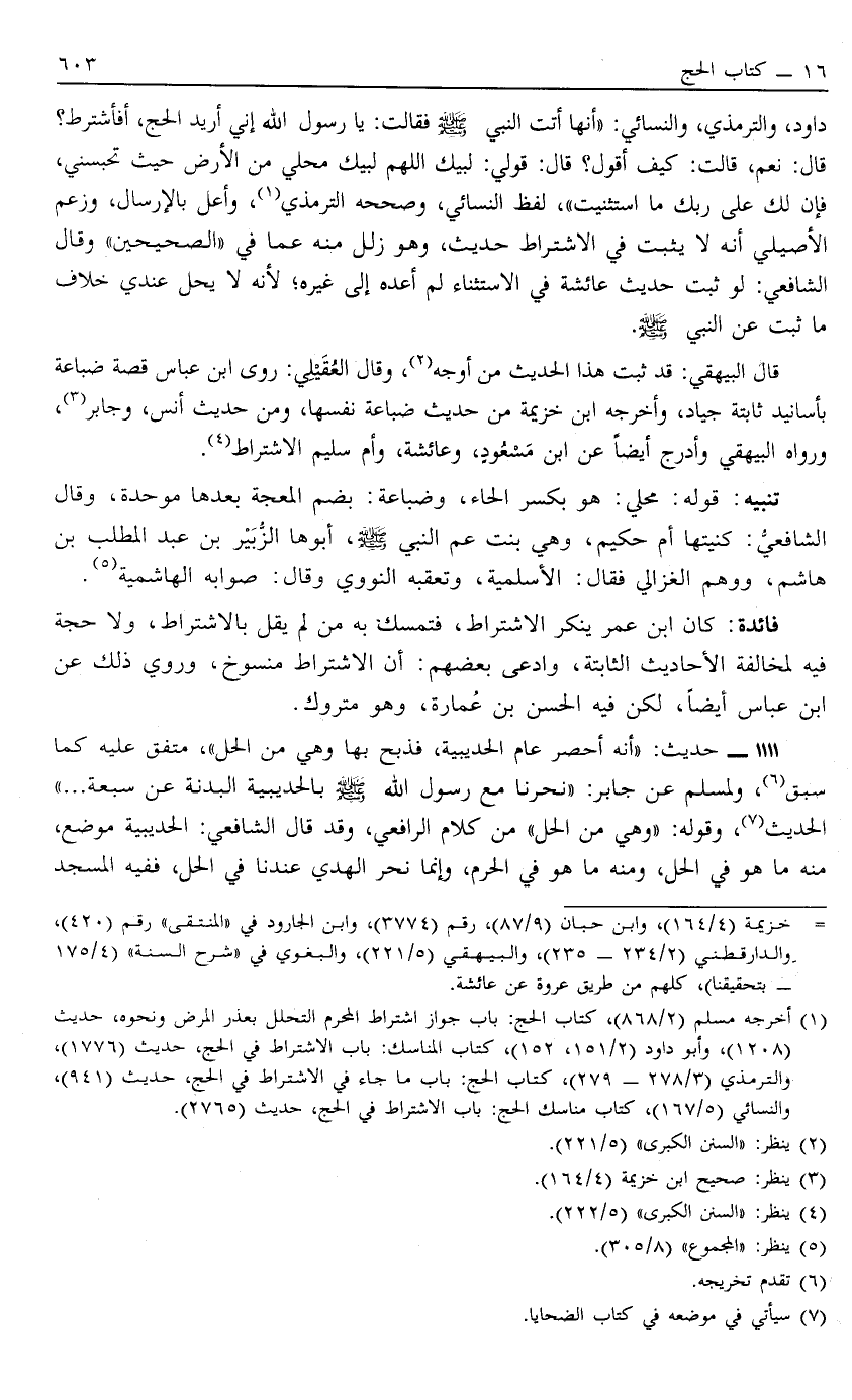 1 أخرجه مسلم "2/868"، كتاب الحج: باب جواز اشتراط التحلل بعذر المرض ونحوه، حديث "1208"، وأبو داود "2/151، 152" كتاب المناسك: باب الاشتراط في الحج، حديث "1776"، والترمذي "3/278- 279" كتاب الحج: باب ما جاء في الاشتراط في الحج، حديث "941"، والنسائي "5/167" كتاب مناسك الحج: باب الاشتراط في الحج، حديث "2765".