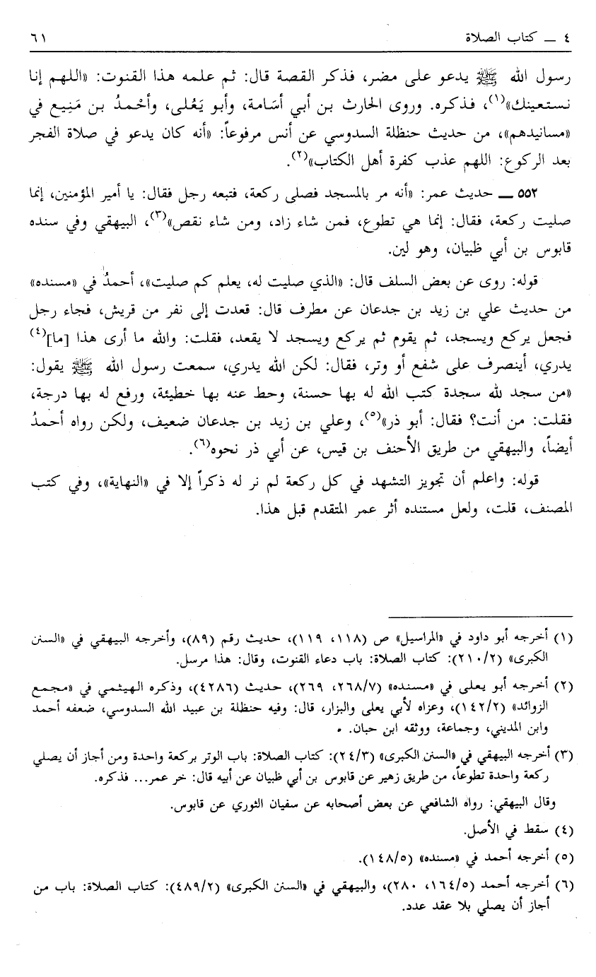 552 - حَدِيثُ عُمَرَ أَنَّهُ مَرَّ بِالْمَسْجِدِ فَصَلَّى رَكْعَةً فَتَبِعَهُ رَجُلٌ فَقَالَ يَا أَمِيرَ الْمُؤْمِنِينَ إنَّمَا صَلَّيْتَ رَكْعَةً فَقَالَ إنَّمَا هِيَ تَطَوُّعٌ فَمَنْ شَاءَ زَادَ وَمَنْ شَاءَ نَقَصَ3 الْبَيْهَقِيُّ وَفِي سَنَدِهِ قَابُوسُ بْنُ أَبِي ظَبْيَانَ وَهُوَ لَيِّنٌ.