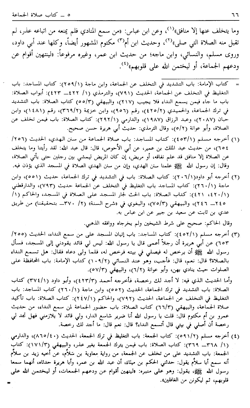 وَمَا يَتَخَلَّفُ عَنْهَا إلَّا مُنَافِقٌ1 وَعَنْ ابْنِ عَبَّاسٍ "مَنْ سَمِعَ الْمُنَادِيَ فَلَمْ يَمْنَعْهُ مِنْ اتِّبَاعِهِ عُذْرٌ لَمْ تُقْبَلْ مِنْهُ الصَّلَاةُ الَّتِي صَلَّى"2 وَحَدِيثُ ابْنِ أُمِّ3 مَكْتُومٍ الْمَشْهُورُ أَيْضًا وَكُلُّهَا عِنْدَ أَبِي دَاوُد وَرَوَى مُسْلِمٌ وَالنَّسَائِيُّ وَابْنُ مَاجَهْ مِنْ حَدِيثِ ابْنِ عُمَرَ وَغَيْرِهِ مَرْفُوعًا "لَيَنْتَهِيَنَّ أَقْوَامٌ عَنْ وَدْعِهِمْ الْجَمَاعَةَ أَوْ لَيَخْتِمَنَّ اللَّهُ عَلَى قُلُوبِهِمْ" 4.