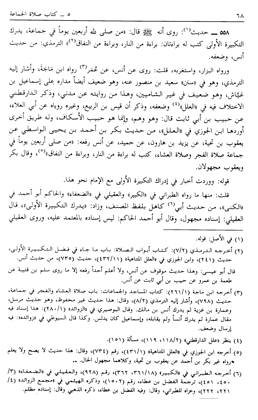 558 - حَدِيثُ1 رُوِيَ أَنَّهُ صَلَّى اللَّهُ عَلَيْهِ وَسَلَّمَ قَالَ "مَنْ صَلَّى لِلَّهِ أَرْبَعِينَ يَوْمًا فِي جَمَاعَةٍ يُدْرِكُ التَّكْبِيرَةَ الْأُولَى كُتِبَ لَهُ بَرَاءَتَانِ بَرَاءَةٌ مِنْ النَّارِ وَبَرَاءَةٌ مِنْ النِّفَاقِ" 2 التِّرْمِذِيُّ مِنْ حَدِيثِ أَنَسٍ وَضَعَّفَهُ.