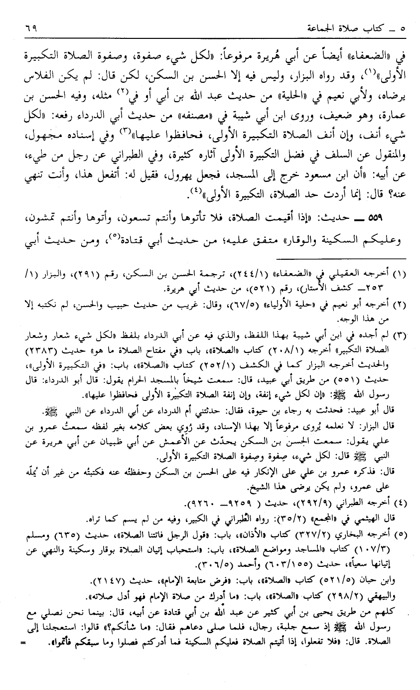 فِي الضُّعَفَاءِ أَيْضًا عَنْ أَبِي هُرَيْرَةَ مَرْفُوعًا لِكُلِّ شَيْءٍ صَفْوَةٌ وَصَفْوَةُ الصَّلَاةِ التَّكْبِيرَةُ الْأُولَى1 وَقَدْ رَوَاهُ الْبَزَّارُ وَلَيْسَ فِيهِ إلَّا الْحَسَنُ بْنُ السَّكَنِ لَكِنْ قَالَ لَمْ يَكُنْ الْفَلَّاسُ يَرْضَاهُ وَلِأَبِي نُعَيْمٍ فِي الْحِلْيَةِ مِنْ حَدِيثِ عَبْدِ اللَّهِ بْنِ أَبِي أَوْفَى2 مِثْلُهُ وَفِيهِ الْحَسَنُ بْنُ عُمَارَةَ وَهُوَ ضَعِيفٌ وَرَوَى ابْنُ أَبِي شَيْبَةَ فِي مُصَنَّفِهِ مِنْ حَدِيثِ أَبِي الدَّرْدَاءِ رَفَعَهُ "لِكُلِّ شَيْءٍ أَنْفٌ وَإِنَّ أَنْفَ الصَّلَاةِ التَّكْبِيرَةُ الْأُولَى فَحَافِظُوا عَلَيْهَا" 3 وَفِي إسْنَادِهِ مَجْهُولٌ وَالْمَنْقُولُ عَنْ السَّلَفِ فِي فَضْلِ التَّكْبِيرَةِ الْأُولَى آثَارٌ كَثِيرَةٌ وَفِي الطَّبَرَانِيِّ عن رجل من طيء عَنْ أَبِيهِ أَنَّ ابْنَ مَسْعُودٍ خَرَجَ إلَى الْمَسْجِدِ فَجَعَلَ يُهَرْوِلُ فَقِيلَ لَهُ أَتَفْعَلُ هَذَا وَأَنْتَ تَنْهَى عَنْهُ قَالَ إنَّمَا أَرَدْت حَدَّ الصَّلَاةِ التَّكْبِيرَةَ الْأُولَى4.
