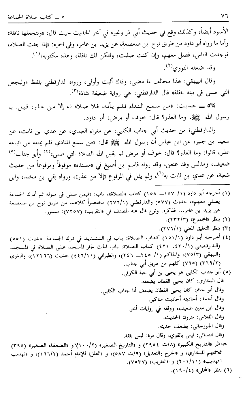 4 * أخرجه أبو داود "1/151" كتاب الصلاة: باب في التشديد في ترك الجماعة، حديث "551" والدارقطني "1/420، 421" كتاب الصلاة: باب الحث لجار المسجد على الصلاة في المسجد، والبيهقي "3/57"، والحاكم "1/245- 246"، والطبراني "11/446" حديث "12266"، والبغوي "2/369" "795" كلهم من طريق أبي جناب.