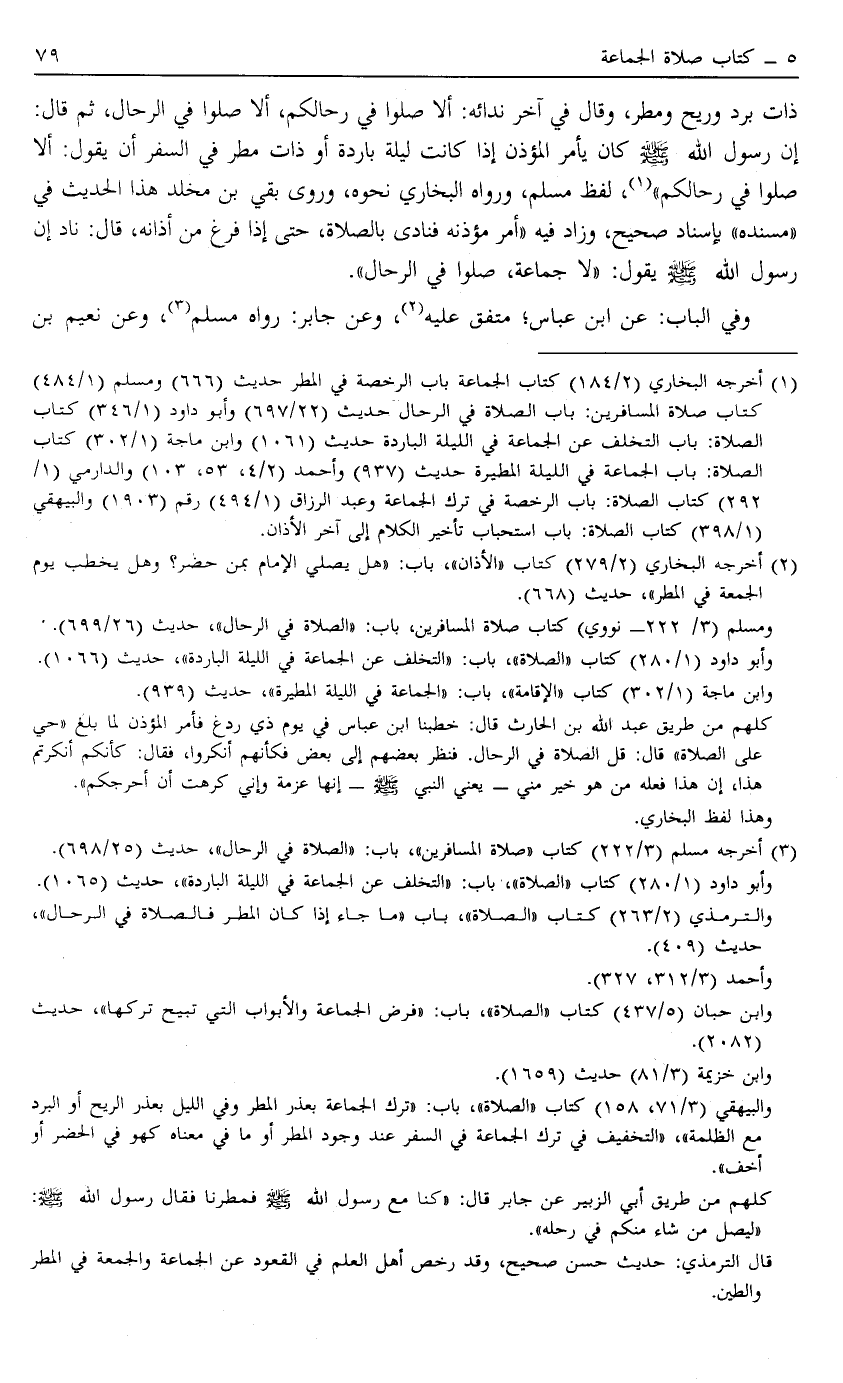 1 أخرجه البخاري "2/184" كتاب الجماعة: باب الرخصة في المطر، حديث "666"، ومسلم "1/484" كتاب صلاة المسافرين: باب الصلاة في الرحال، حديث "22/697" وأبو داود "1/346" كتاب الصلاة: باب التخلف عن الجماعة في الليلة الباردة، حديث "1061"، وابن ماجة "1/302" كتاب الصلاة: باب الجماعة في الليلة المطيرة حديث "937" وأحمد "2/4، 53، 103" والدارمي "1/292" كتاب الصلاة: باب الرخصة في ترك الجماعة، وعبد الرزاق "1/494" رقم "1903" والبيهقي "1/398" كتاب الصلاة: باب استحباب تأخير الكلام إلى آخر الأذان.
