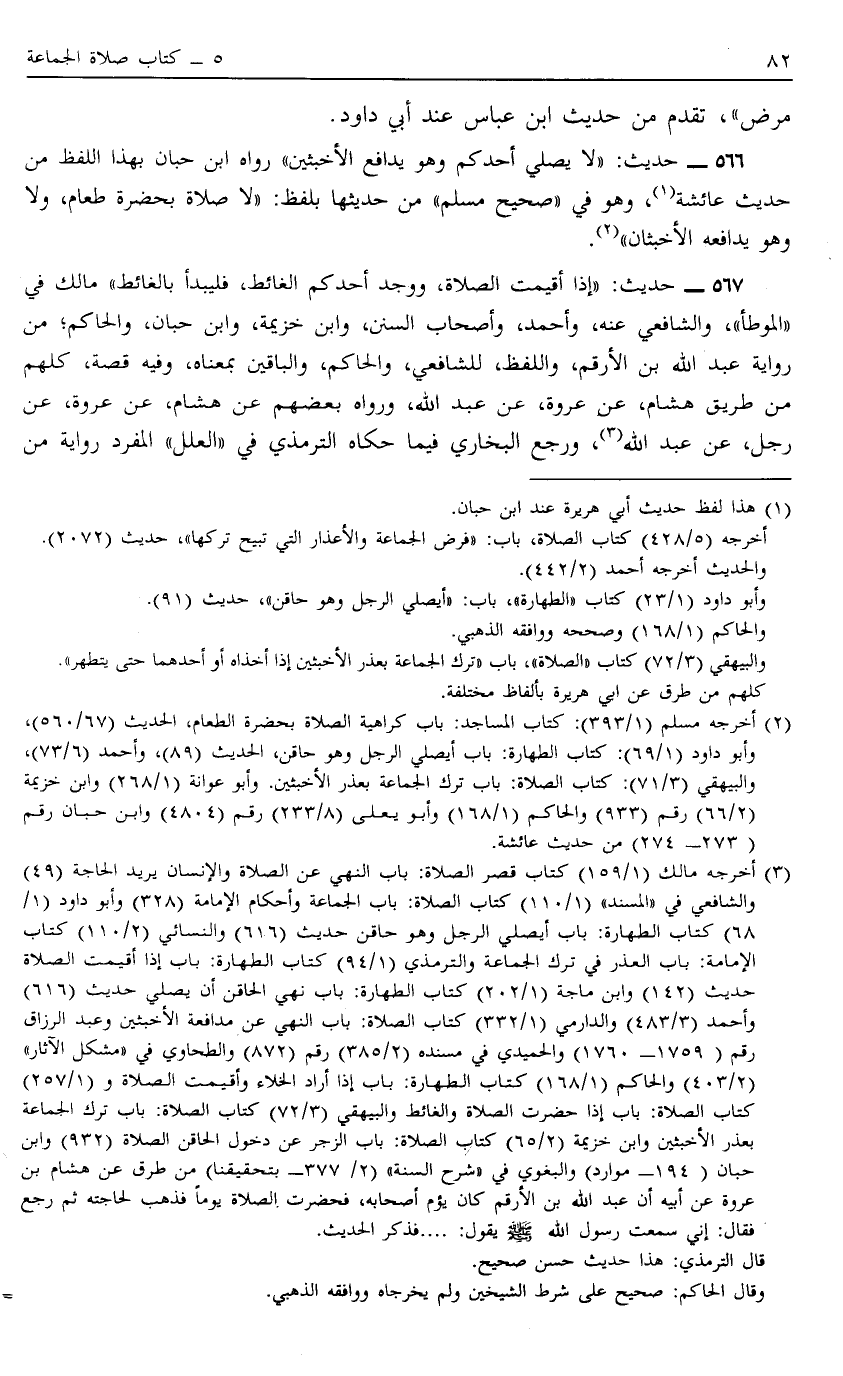566 - حَدِيثُ لَا يُصَلِّي أَحَدُكُمْ وَهُوَ يُدَافِعُ الْأَخْبَثَيْنِ رَوَاهُ ابْنُ حِبَّانَ بِهَذَا اللَّفْظِ مِنْ حَدِيثِ عَائِشَةَ1 وَهُوَ فِي صَحِيحِ مُسْلِمٍ مِنْ حَدِيثِهَا بِلَفْظِ "لَا صَلَاةَ بِحَضْرَةِ طَعَامٍ وَلَا وَهُوَ يُدَافِعُهُ الْأَخْبَثَانِ" 2.