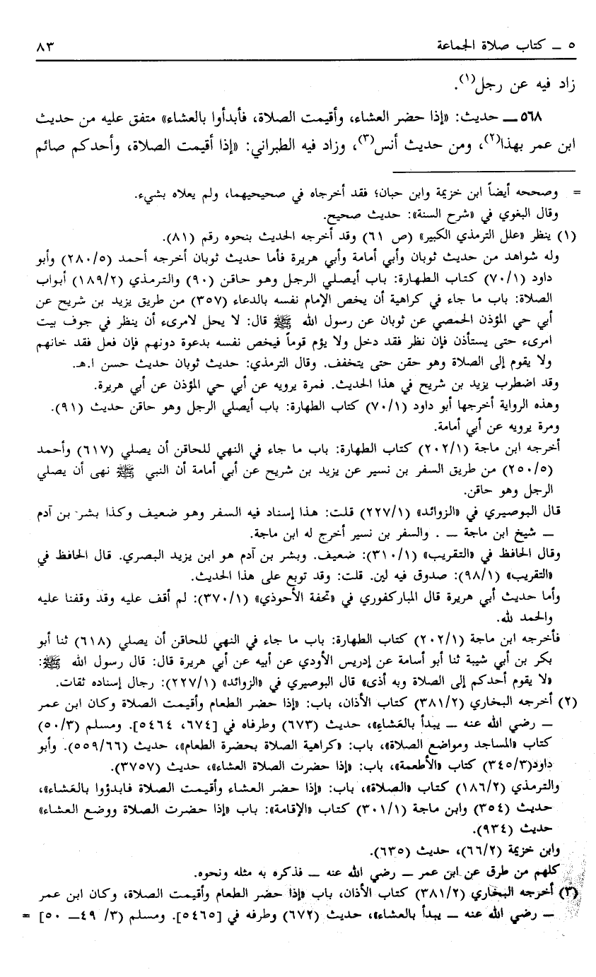 والترمذي "2/186" كتاب الصلاة: باب إذا حضر العشاء وأقيمت الصلاة فابدؤوا بالعَشاء، حديث "354" وابن ماجة "1/301" كتاب الإقامة: باب إذا حضرت الصلاة ووضع العشاء، حديث "934".