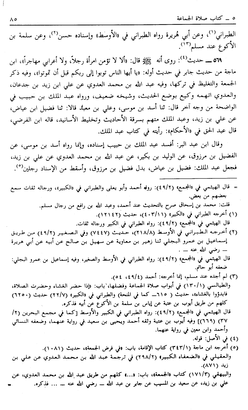 569 - حَدِيثُ4 رُوِيَ أَنَّهُ صَلَّى اللَّهُ عَلَيْهِ وَسَلَّمَ قَالَ "أَلَا لَا تَؤُمَّنَّ امْرَأَةٌ رَجُلًا وَلَا أَعْرَابِيٌّ مُهَاجِرًا" ابْنُ مَاجَهْ مِنْ حَدِيثِ جَابِرٍ فِي حَدِيثِ أَوَّلُهُ "يَا أَيُّهَا النَّاسُ تُوبُوا إلَى رَبِّكُمْ قَبْلَ أَنْ تَمُوتُوا" وَفِيهِ ذَكَرَ الْجُمُعَةَ وَالتَّغْلِيظَ فِي تَرْكِهَا وَفِيهِ عَبْدُ اللَّهِ بْنُ مُحَمَّدٍ الْعَدَوِيُّ عَنْ عَلِيِّ بْنِ زَيْدِ بْنِ جُدْعَانَ وَالْعَدَوِيُّ اتَّهَمَهُ وَكِيعٌ بِوَضْعِ الْحَدِيثِ وَشَيْخُهُ ضَعِيفٌ وَرَوَاهُ عَبْدُ الْمَلِكِ بْنُ حَبِيبٍ فِي الْوَاضِحَةِ مِنْ وَجْهٍ آخَرَ قَالَ ثَنَا أَسَدُ بْنُ مُوسَى وَعَلِيُّ بْنُ مَعْبَدٍ قَالَا ثَنَا فُضَيْلُ بْنُ عِيَاضٍ عَنْ عَلِيِّ بْنِ زَيْدٍ وَعَبْدُ الْمَلِكِ مُتَّهَمٌ بِسَرِقَةِ الْأَحَادِيثِ وَتَخْلِيطِ الْأَسَانِيدِ قَالَهُ ابْنُ الْفَرْضِيُّ قَالَ عَبْدُ الْحَقِّ فِي الْأَحْكَامِ رَأَيْتُهُ فِي كِتَابِ عَبْدِ الْمَلِكِ.