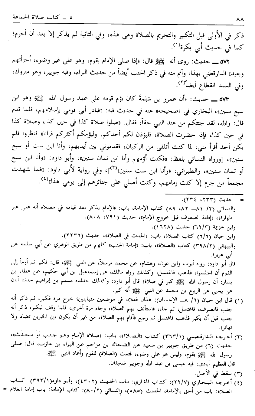 573 - حَدِيثُ أَنَّ عَمْرَو بْنَ سَلَمَةَ كَانَ يَؤُمُّ قَوْمَهُ عَلَى عَهْدِ رَسُولِ اللَّهِ صَلَّى اللَّهُ عَلَيْهِ وَسَلَّمَ وَهُوَ ابْنُ سَبْعِ سِنِينَ الْبُخَارِيُّ فِي صَحِيحِهِ عنه فِي حَدِيثٍ فِيهِ فَبَادَرَ أَبِي قَوْمِي بِإِسْلَامِهِمْ فَلَمَّا قَدِمَ قَالَ وَاَللَّهِ لَقَدْ جِئْتُكُمْ مِنْ عِنْدِ النَّبِيِّ حَقًّا فَقَالَ "صَلُّوا صَلَاةَ كَذَا فِي حِينِ كَذَا وَصَلَاةَ كَذَا فِي حِينِ كَذَا فَإِذَا حَضَرَتْ الصَّلَاةُ فَلْيُؤَذِّنْ لَكُمْ أَحَدُكُمْ وَلْيَؤُمَّكُمْ أَكْثَرُكُمْ قُرْآنًا" فَنَظَرُوا فَلَمْ يَكُنْ أَحَدٌ أَقْرَأُ مِنِّي لِمَا كُنْتُ أَتَلَقَّى مِنْ الرُّكْبَانِ فَقَدَّمُونِي بَيْنَ أَيْدِيهمْ وَأَنَا ابْنُ سِتِّ أَوْ سَبْعِ سِنِينَ وَرَوَاهُ النَّسَائِيُّ بِلَفْظِ فَكُنْتُ أَؤُمُّهُمْ وَأَنَا ابْنُ ثَمَانِ سِنِينَ وَأَبُو دَاوُد وَأَنَا ابْنُ سَبْعِ أَوْ ثَمَانِ سِنِينَ وَالطَّبَرَانِيُّ وَأَنَا ابْنُ سِتِّ سِنِينَ3 وَفِي رِوَايَةٍ لِأَبِي دَاوُد فَمَا شَهِدْتُ مَجْمَعًا مِنْ جَرْمٍ إلَّا كُنْتُ إمَامَهُمْ وَكُنْتُ أُصَلِّي عَلَى جَنَائِزِهِمْ إلَى يَوْمِي هَذَا4.