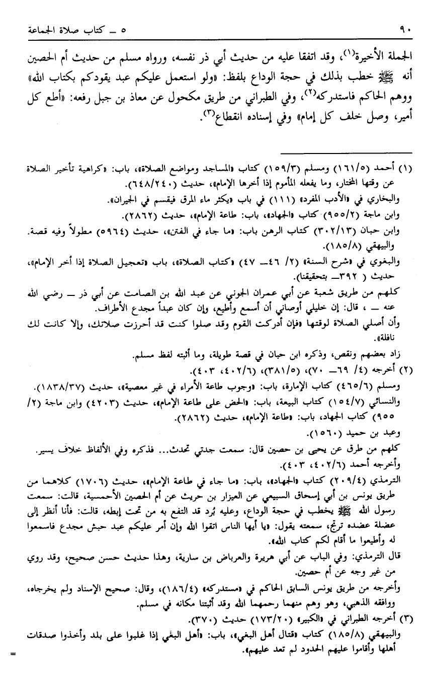 الْجُمْلَةِ الْأَخِيرَةِ1 وَقَدْ اتفقتا عَلَيْهِ مِنْ حَدِيثِ أَبِي ذَرٍّ نَفْسِهِ وَرَوَاهُ مُسْلِمٌ مِنْ حَدِيثِ أُمِّ الْحُصَيْنِ أَنَّهُ صَلَّى اللَّهُ عَلَيْهِ وَسَلَّمَ خَطَبَ بِذَلِكَ فِي حَجَّةِ الْوَدَاعِ بِلَفْظِ وَلَوْ اُسْتُعْمِلَ عَلَيْكُمْ عَبْدٌ يَقُودُكُمْ بِكِتَابِ اللَّهِ وَوَهَمَ الْحَاكِمُ فَاسْتَدْرَكَهُ2 وَفِي الطَّبَرَانِيِّ مِنْ طَرِيقِ مَكْحُولٍ عَنْ مُعَاذِ بْنِ جَبَلٍ رَفَعَهُ "أَطِعْ كُلَّ أَمِيرٍ وَصَلِّ خَلْفَ كُلِّ إمَامٍ" وَفِي إسْنَادِهِ انْقِطَاعٌ3.