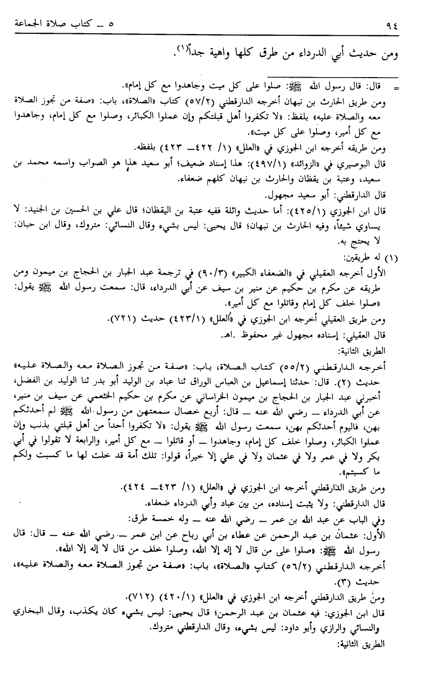 ومن طريق الحارث بن نبهان أخرجه الدارقطني "2/57" كتاب الصلاة، باب صفة من تجوز الصلاة معه، والصلاة عليه، بلفظ: "لا تكفروا أهل قبلتكم وإن عملوا الكبائر، وصلوا مع كل إمام، وجاهدوا مع كل أمير، وصلوا على كل ميت".