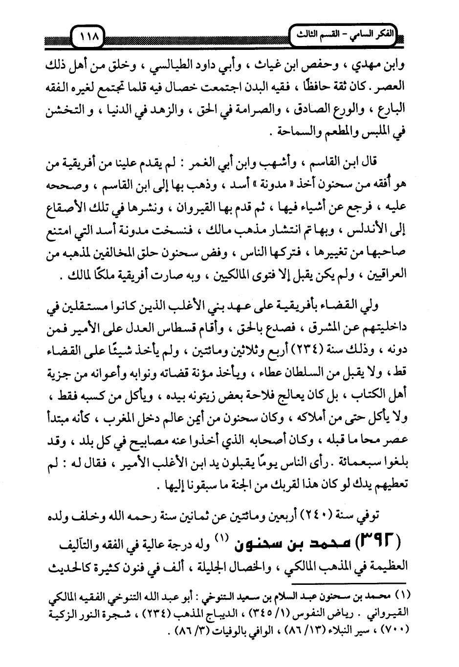 392- محمد بن سحنون 1: وله درجة عالية في الفقه والتآليف العظيمة في المذهب المالكي، والخصال الجليلة، ألف في فنون كثيرة كالحديث