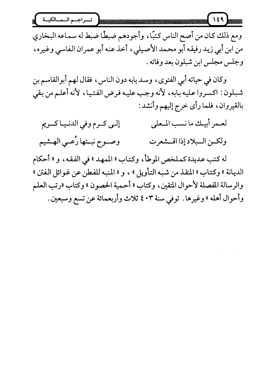 له كتب عديدة كمخلص الموطأ، وكتاب "الممهد" في الفقه، و"أحكام الديانة" وكتاب "المنقذ من شبه التأويل"، و"المنبه للفطن عن غوائل الفتن" والرسالة المفصلة لأحوال المتقين، وكتاب "أحمية الحصون" وكتاب "رتب العلم وأحوال أهله" وغيرها. توفي سنة 403 ثلاث وأربعمائة عن تسع وسبعين.