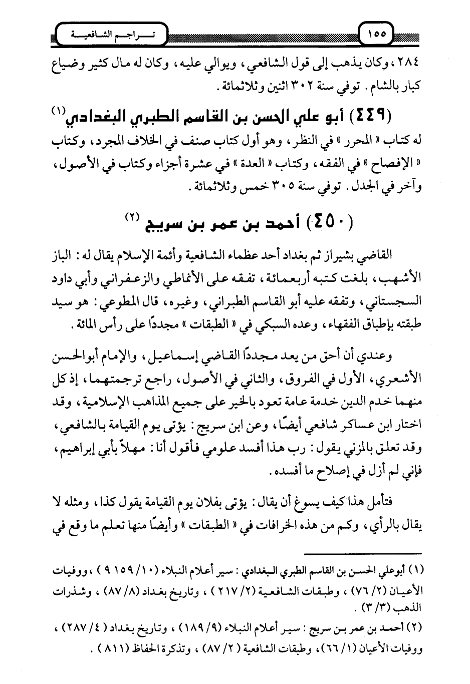 449- أبو علي الحسن بن القاسم الطبري البغدادي 1: له كتاب "المحرر" في النظر، وهو أول كتاب صنف في الخلاف المجرد، وكتاب "الإفصاح" في الفقه، وكتاب "العدة" في عشرة أجزاء وكتاب في الأصول، وآخر في الجدل. توفي سنة 305 خمس وثلاثمائة.