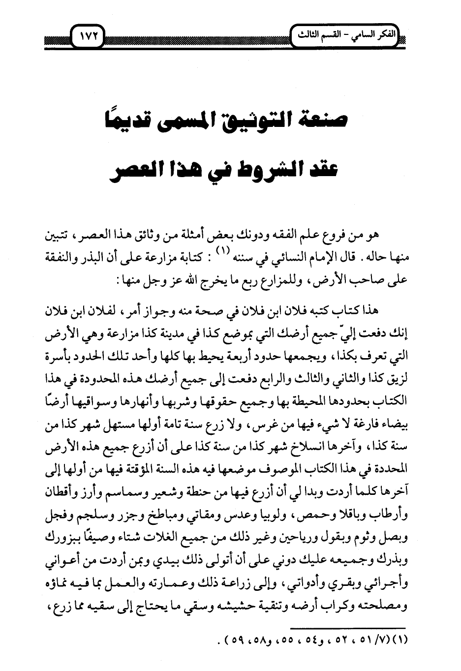 هو من فروع علم الفقه ودونك بعض أمثلة من وثائق هذا العصر، تتبين منها حاله. قال الإمام النسائي في سننه1: كتابة مزارعه على أن البذر والنفقة على صاحب الأرض، وللمزارع ربع ما يخرج الله عز وجل منها: